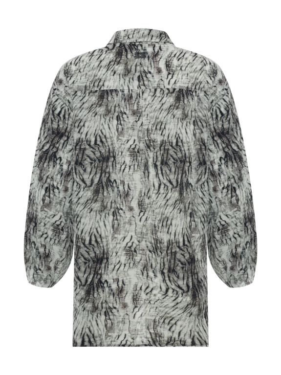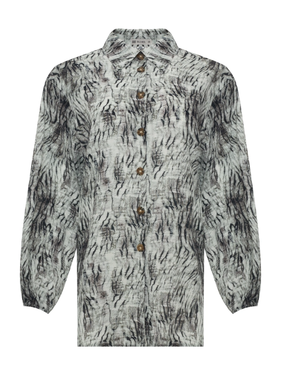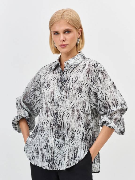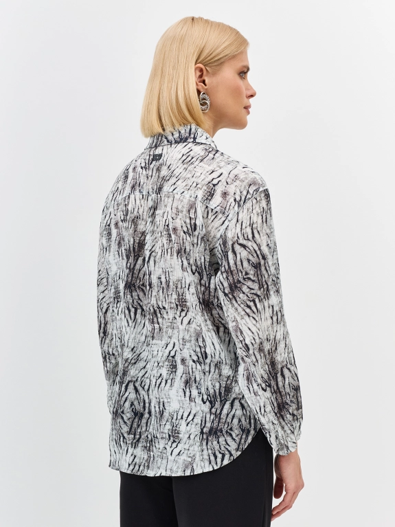 Блузка из вискозы с фантазийным принтом. Свободный силуэт. Рукава 3/4 с резинокой по низу. Отложной воротник. Застежка на роговые пуговицы. Деликатная вышивка на спинке.