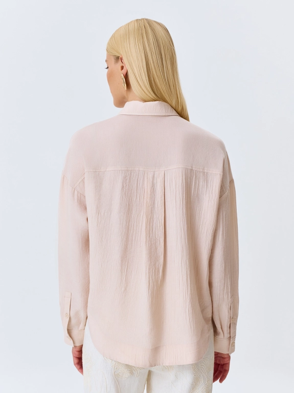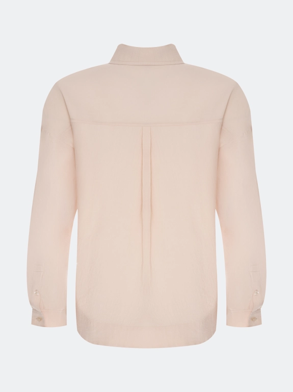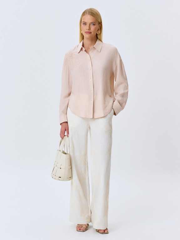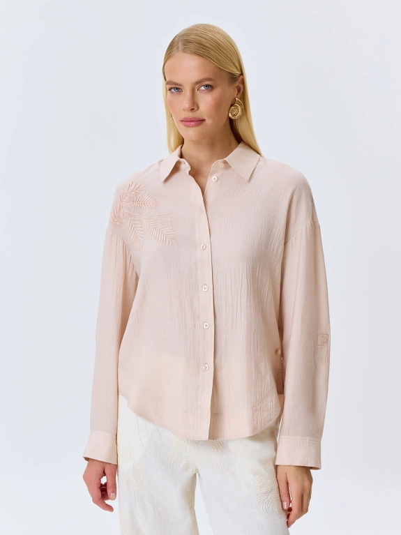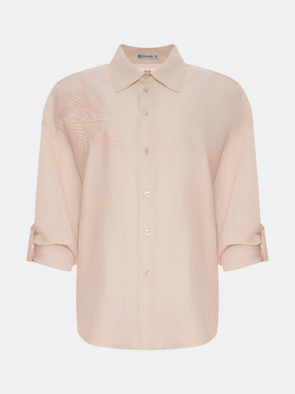 Полупрозрачная блузка из нейлона с акцентной авторской вышивкой. Свободный силуэт. Отложной воротник. Застежка на пуговицы. Спущенная линия плеч и длинные втачные рукава с манжетами и хлястиками по низу. Фигурный низ изделия.