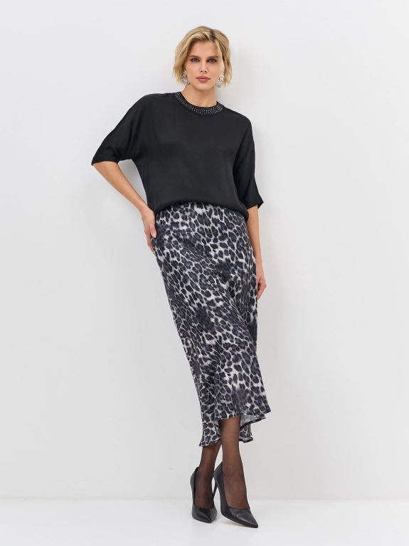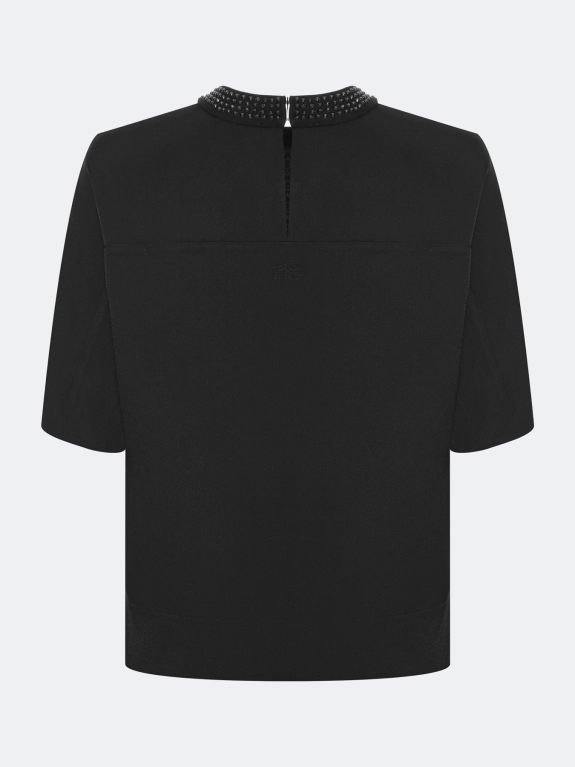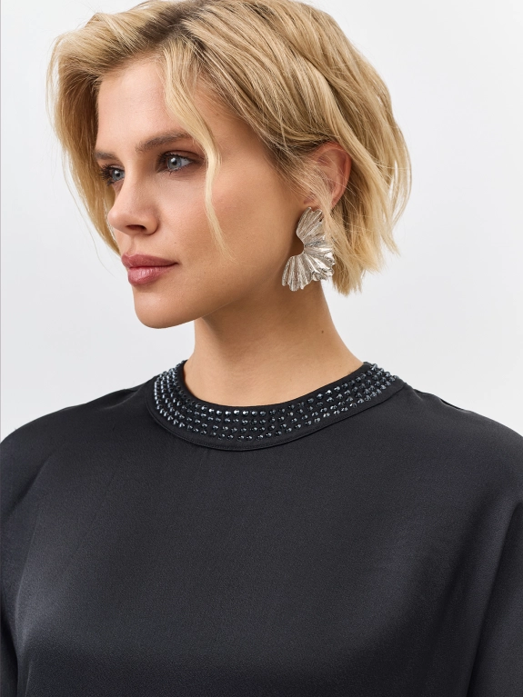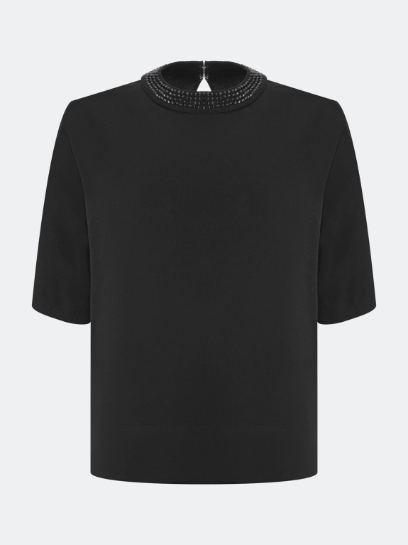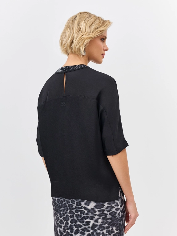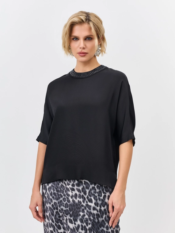 Блузка из атласной 100% вискозы. Свободный силуэт. Круглый вырез дополнен декором из страз в цвет. Застежка на маленькую пуговицу. Укороченные цельнокроенные рукава.