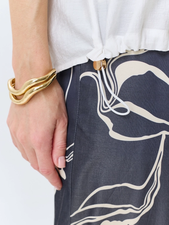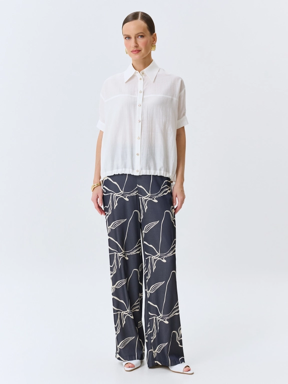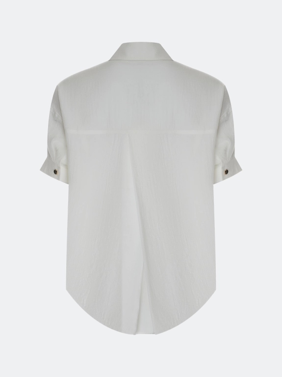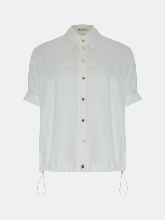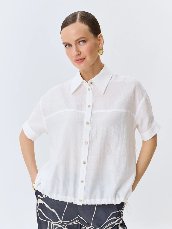 Полупрозрачная легкая блузка свободного силуэта из нейлона. Отложной воротник. Застежка на золотистые пуговицы. Спущенная линия плеч и короткие втачные рукава с манжетами по низу. Дополнена кулисой с утяжниками по низу изделия. Спинка немного удлинена.