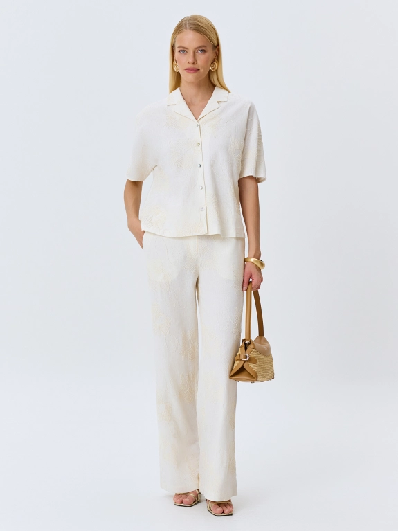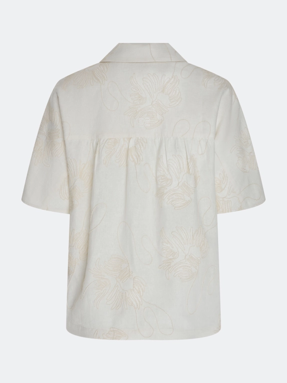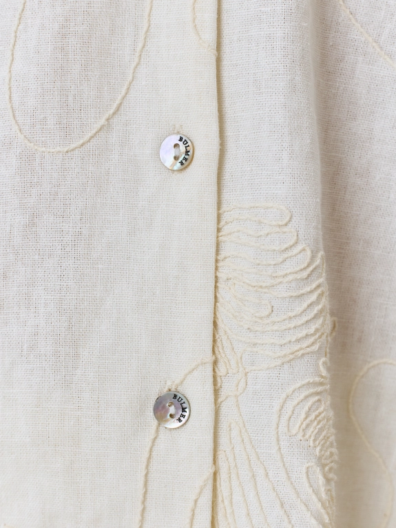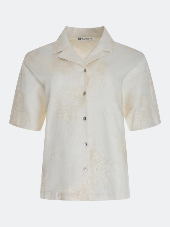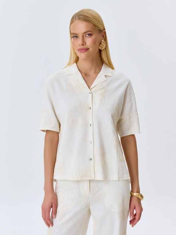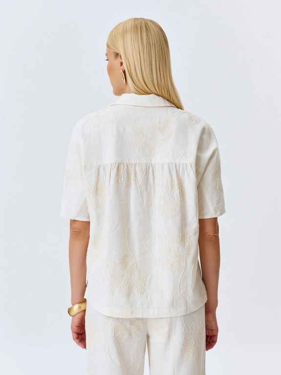 Блузка из смесового льна и вискозы с вышивкой. Свободный силуэт. Классический английский воротник. Застежка на брендированные пуговицы из натурального перламутра. Линия плеч немного спущена и дополнена короткими цельнокроенными рукавами. Комплект с 4267422.