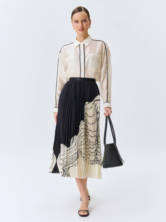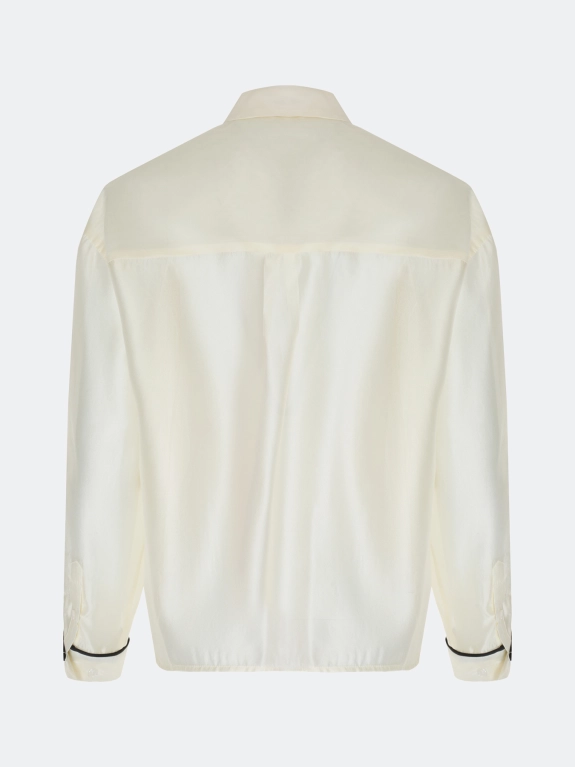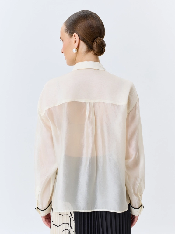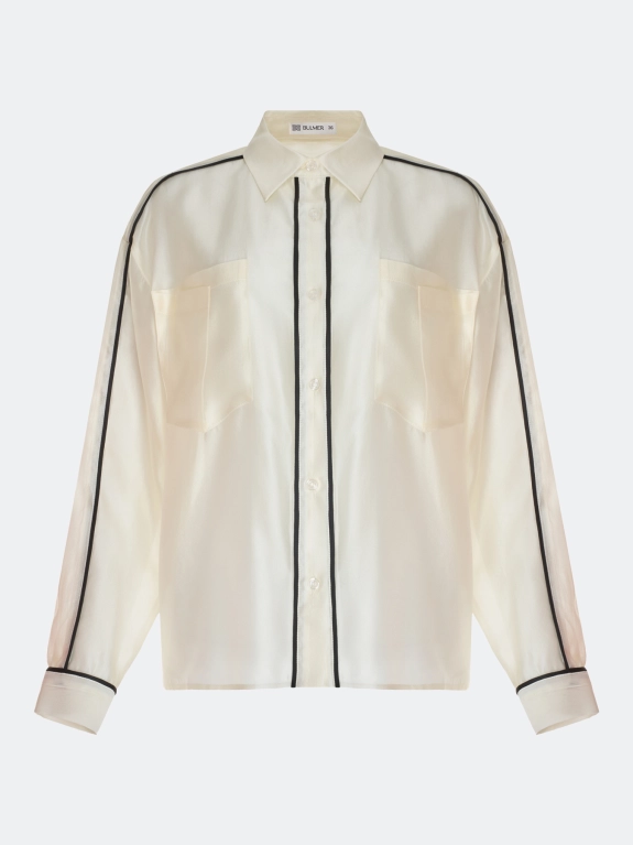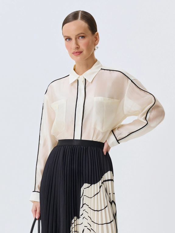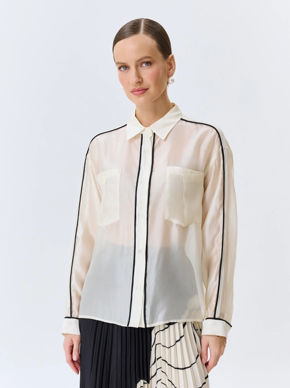 Полупрозрачная сатиновая блузка из смесового района. Свободный силуэт. Отложной воротник. Застежка на пуговицы. Накладные нагрудные карманы. Спущенная линия плеч и длинные рукава с манжетами по низу. Дополнена контрастными кантами.