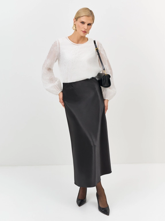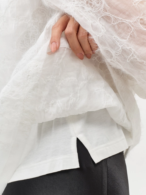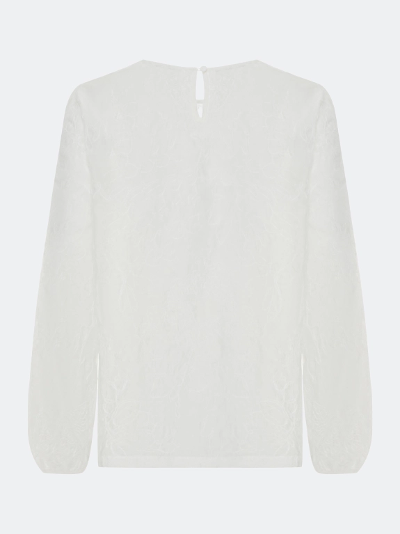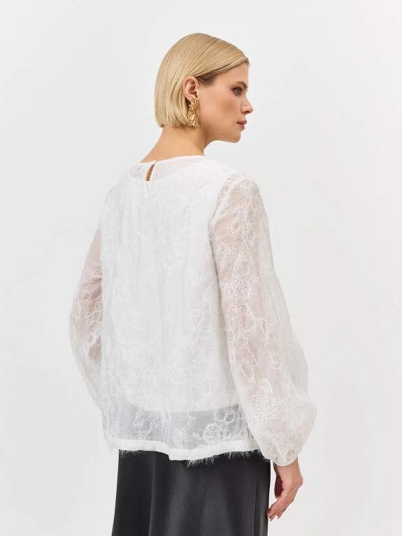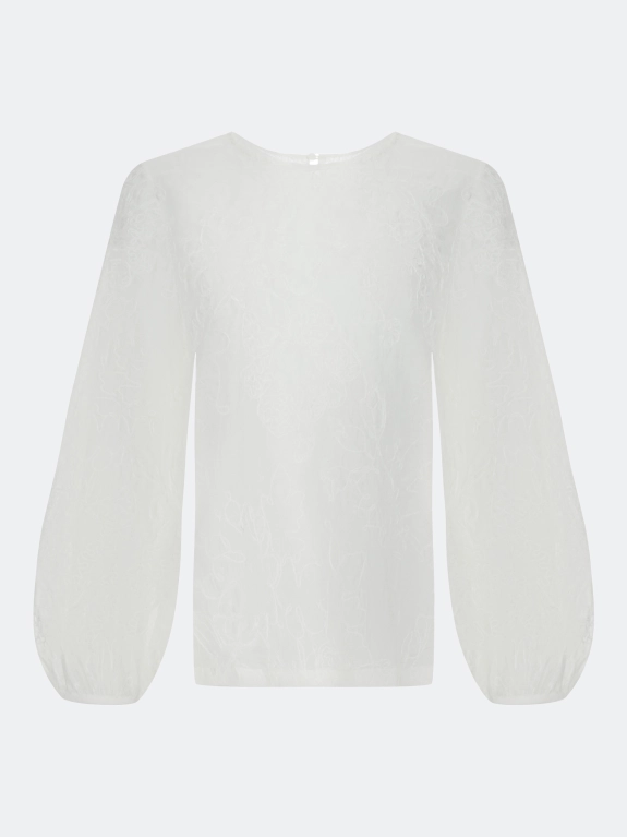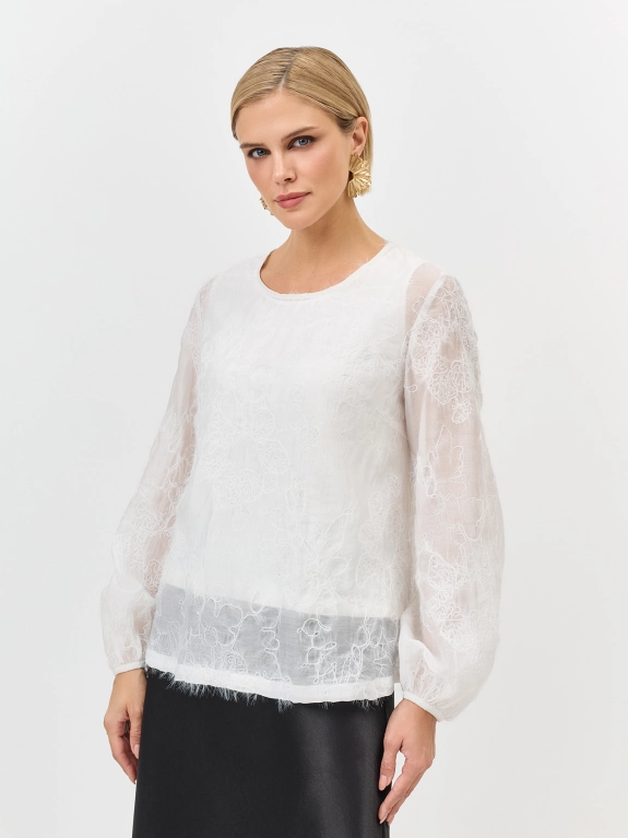Романтичная полупрозрачная блузка из вышитой вискозы. Свободный силуэт. Круглый вырез. Застежка на маленькую пуговицу сзади. Объемные расширенные длинные рукава с резинкой по низу. Подкладка из 100% вискозы.