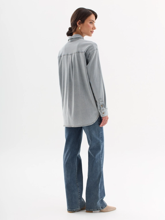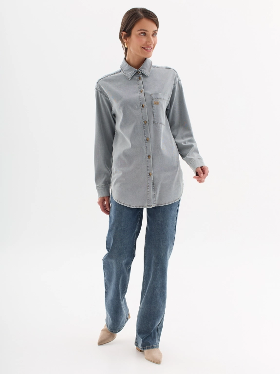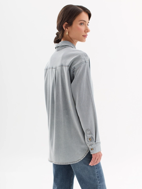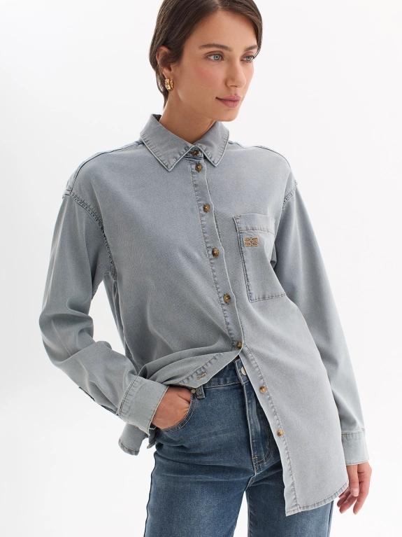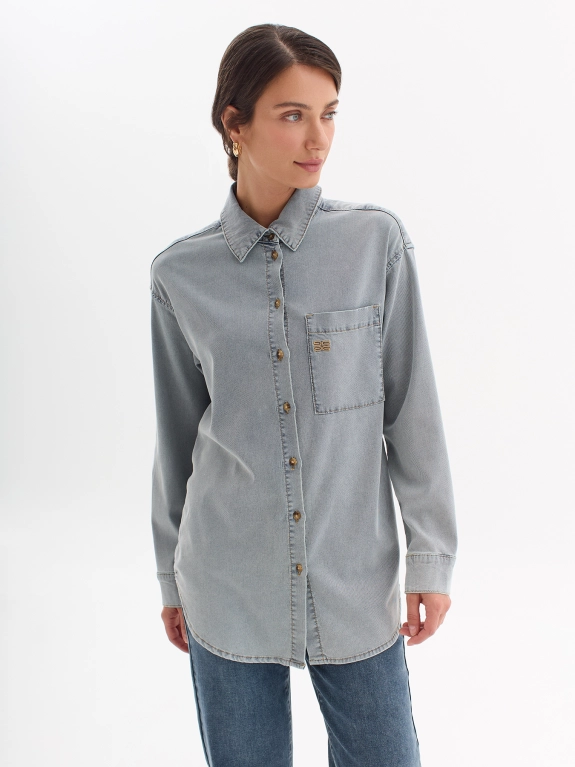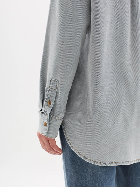 Рубашка с эффектом варки из лиоцелля. Отложной воротник. Застежка на пуговицы. Накладной нагрудный карман с деликатной вышивкой. Свободный силуэт. Спущенное плечо.