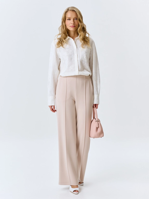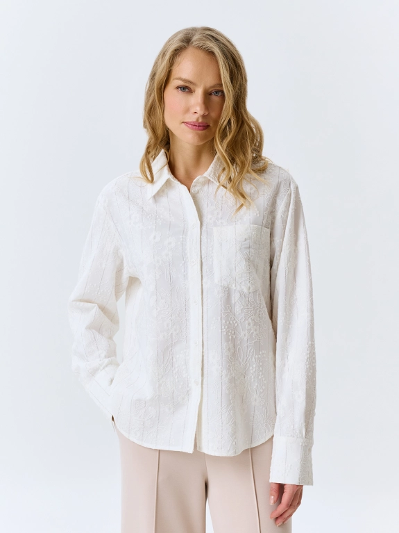 Блузка с ажурной вышивкой в тонкую полоску. Прямой силуэт. Отложной воротник. Застежка на пуговицы. Спущенная линия плеч и длинные объемные рукава с манжетами на пуговицах по низу. В составе район. Дополнена фигурным низом изделия.