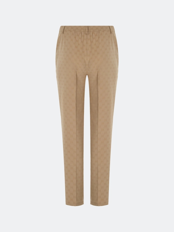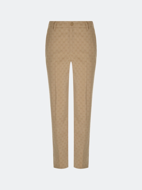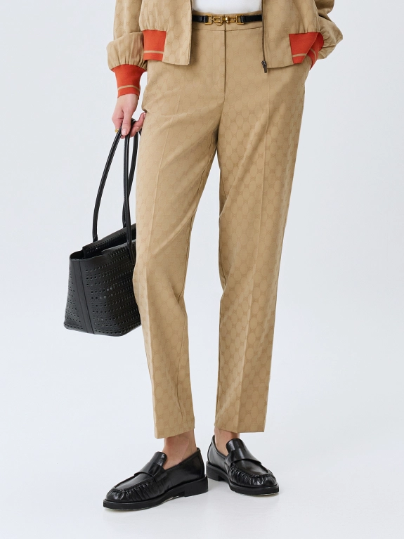 Брюки из жаккардового брендированного текстиля. Прямой силуэт немного заужен к низу. Застежка на молнию и пуговицу. Боковые карманы в швах. Резинка по линии талии по спинке. Дополнены мягкими стрелками. Комплект с 4267337.