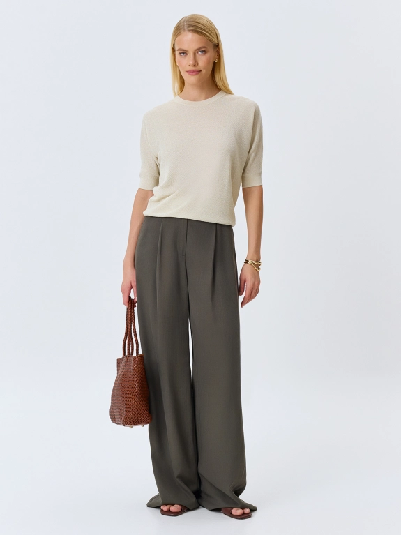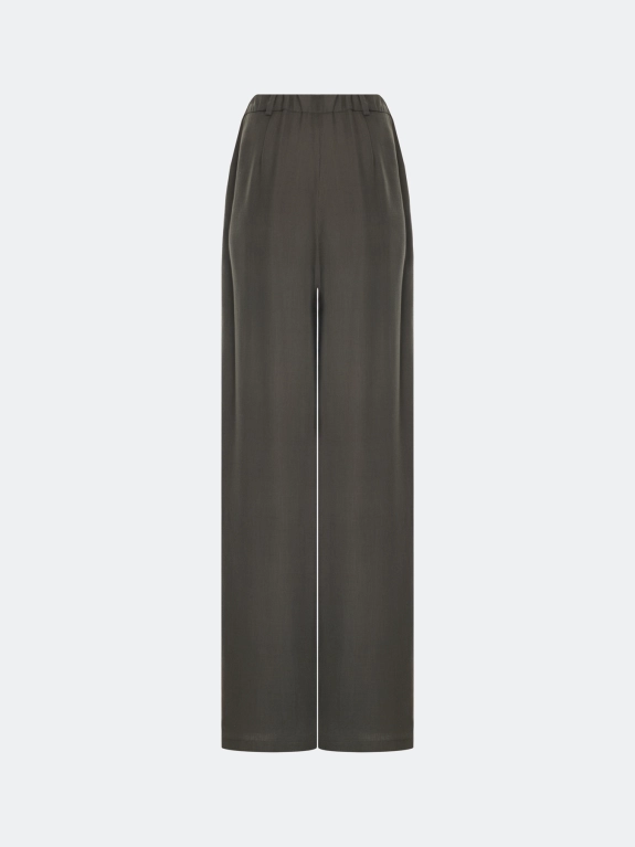 Широкие брюки палаццо из 100% тенселя. Свободный силуэт. Застежка на молнию и пуговицу. Боковые карманы в швах. Резинка по линии талии по спинке. Дополнены мягкими складками.