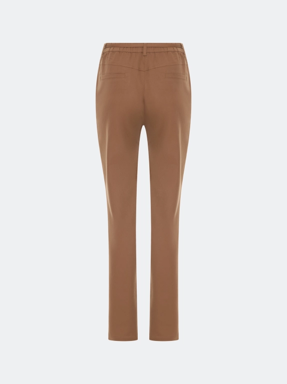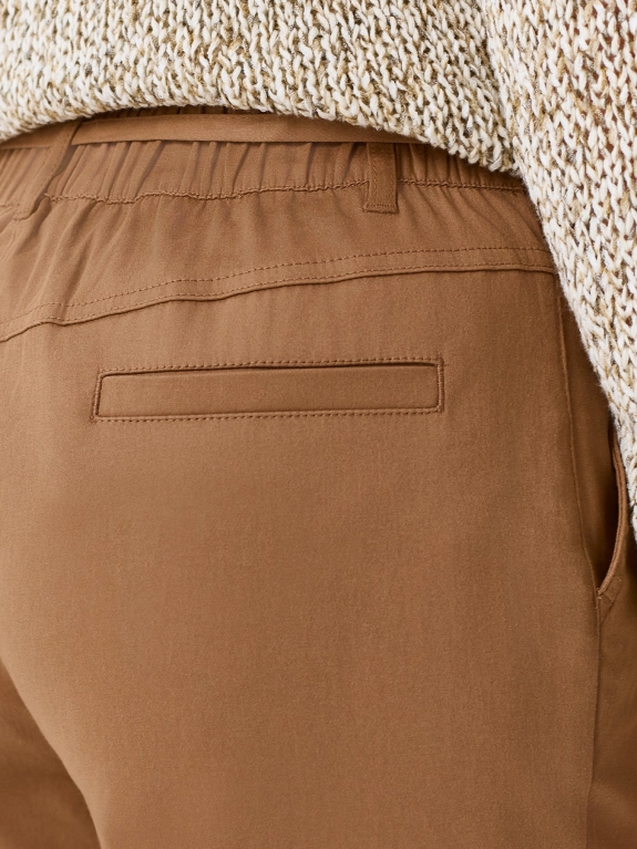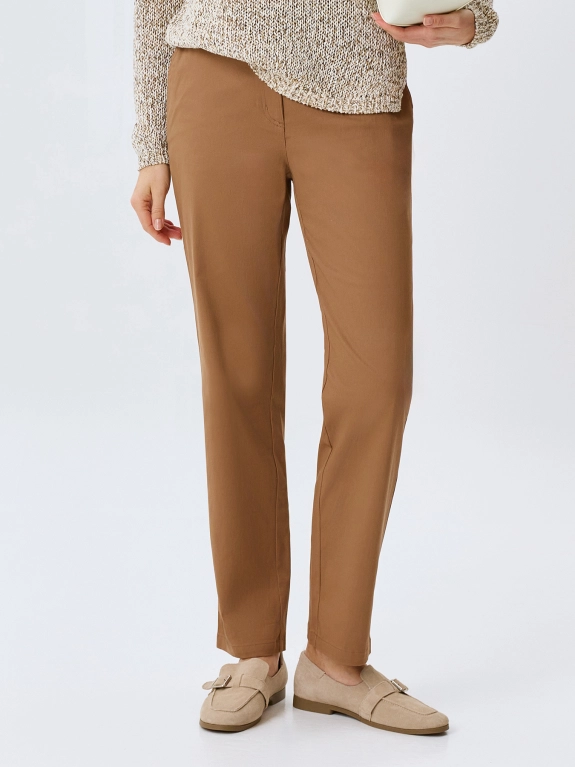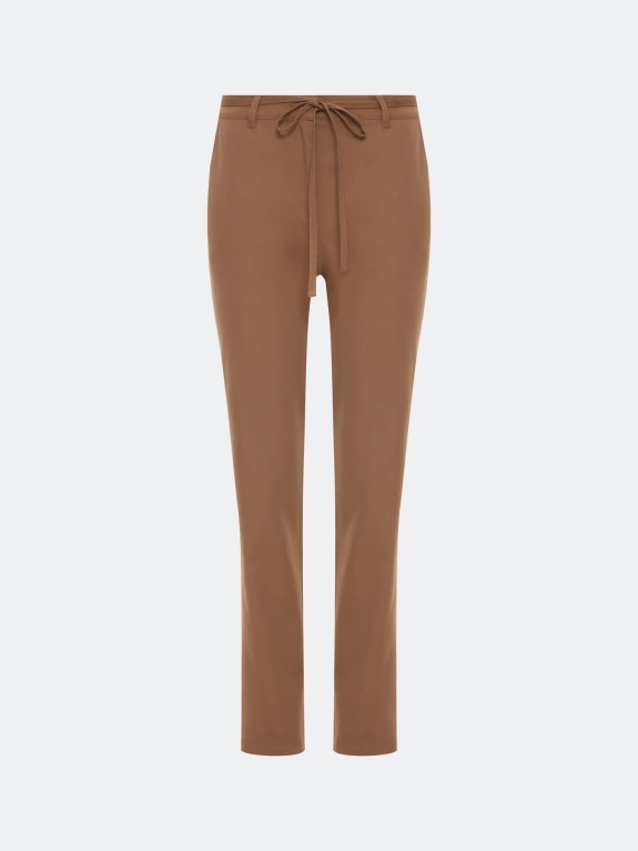 Хлопковые зауженные к низу брюки. Прямой силуэт. Резинка по линии талии. Боковые карманы в швах. Дополнены шлевками и тонким текстильным поясом.