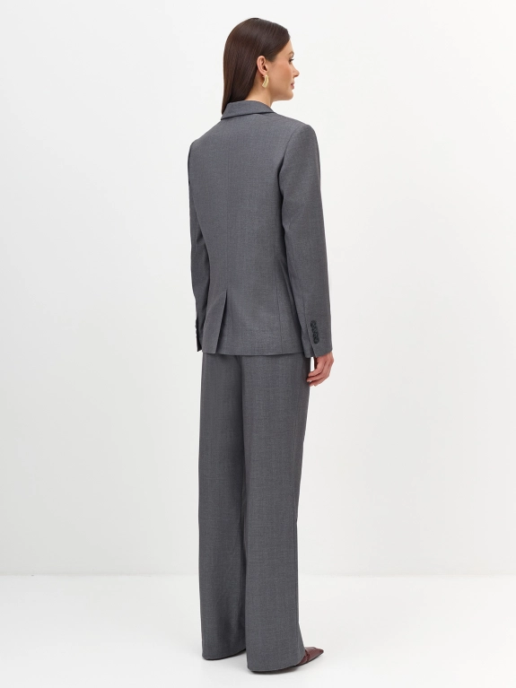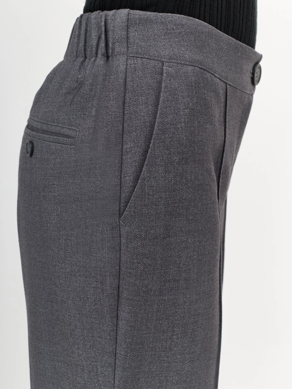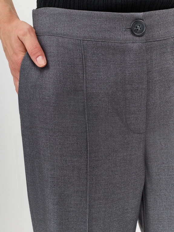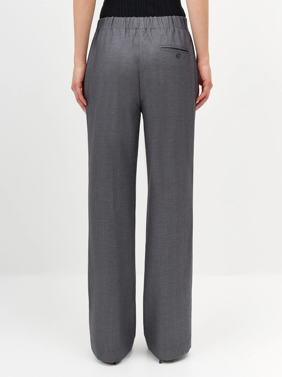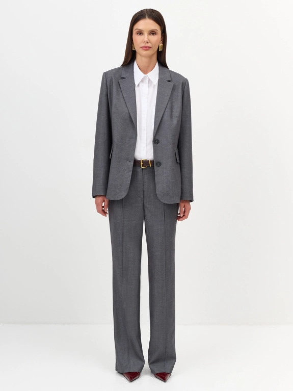 Классические брюки с тенселем и шерстью в составе. Прямой силуэт. Застроченные стрелки. Боковые краманы в швах и прорезной карман сзади. Застежка на молнию и пуговицу. Резинка по линии талии сзади. Комплект с арт. 5257310.