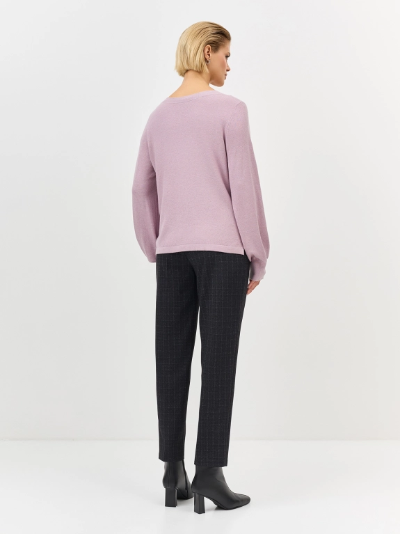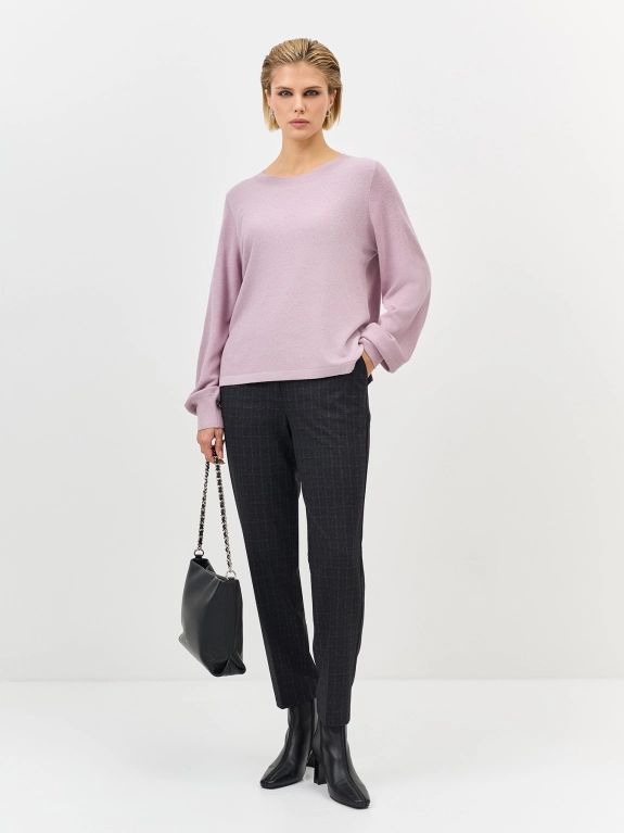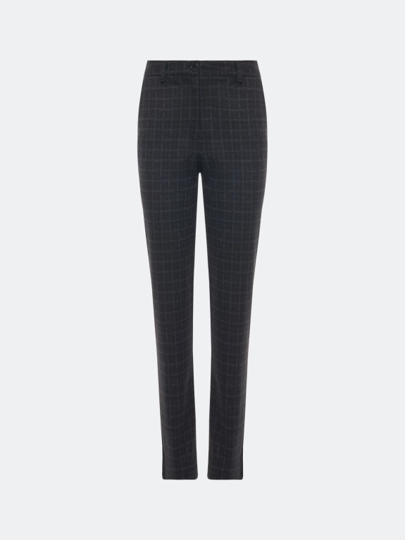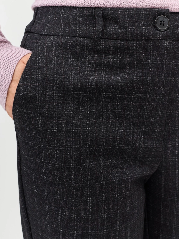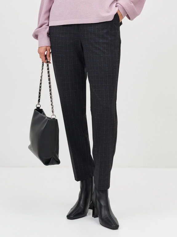 Классические брюки из джерси в клетку. Прямой силуэт заужен к низу. Застежка на молнию и пуговицу. Боковые карманы в швах. Резинка по линии талии сзади. В составе вискоза.