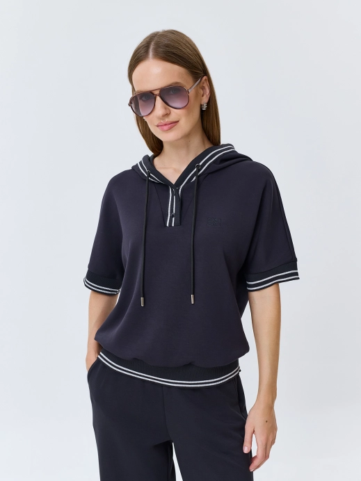 Трикотажные брюки из смесового района. Прямой силуэт. Резинка с полоской люрекса и кулисой по линии талии. Боковые карманы в швах. Комплект с 4267948.