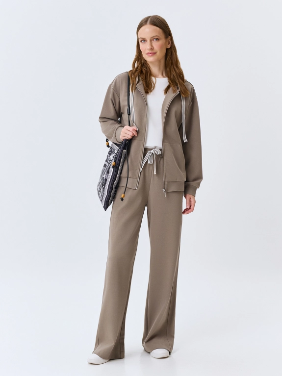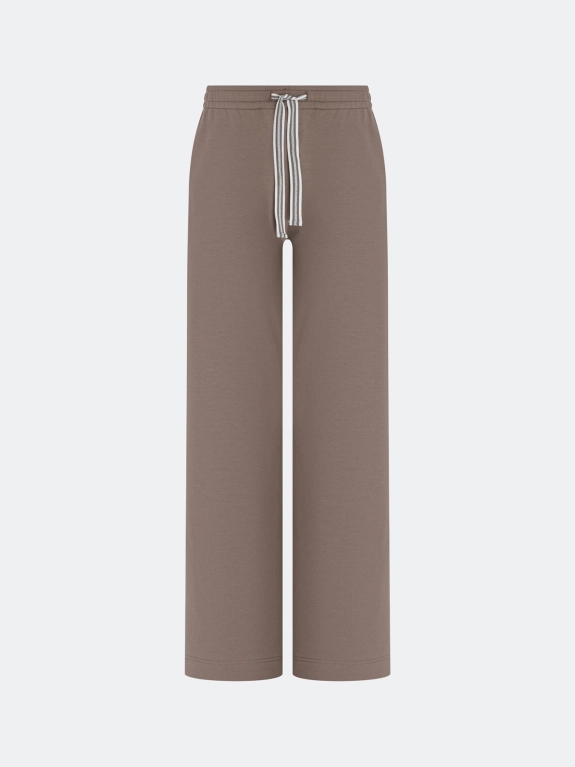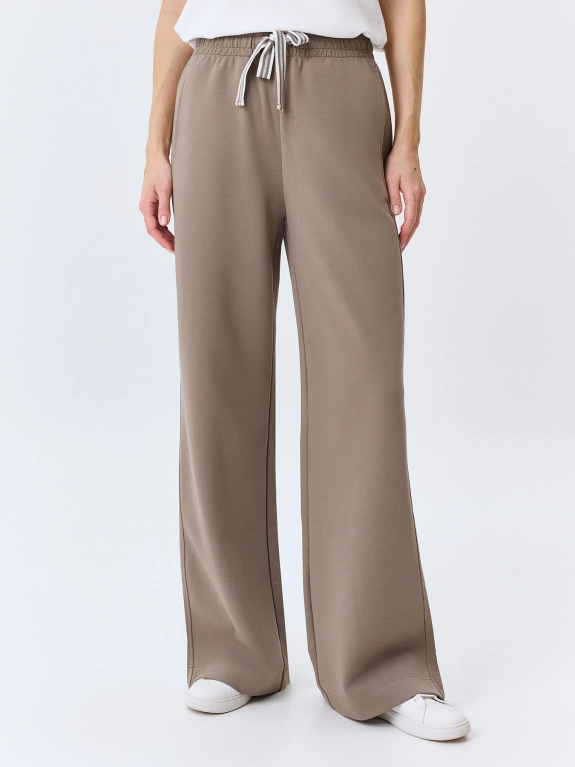 Расслабленные трикотажные брюки из смесового хлопка. Свободный силуэт. Резинка и кулиса с контрастной тесьмой по талии. Боковые карманы в швах. Комплект с 4267820.