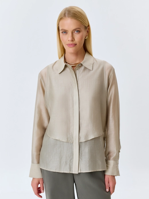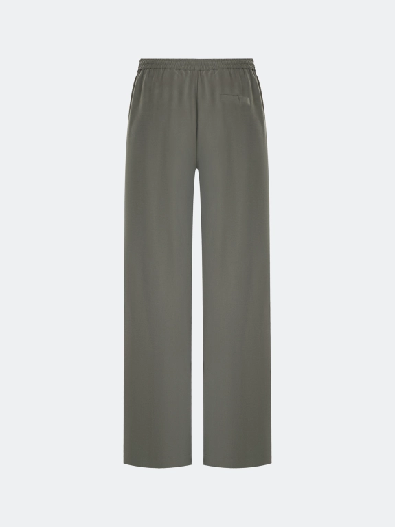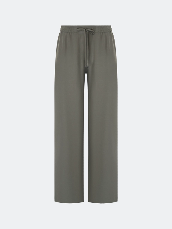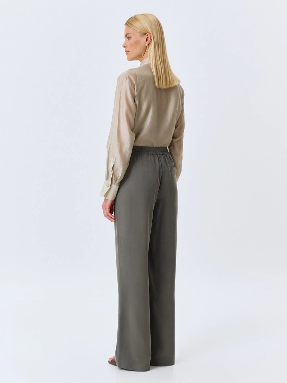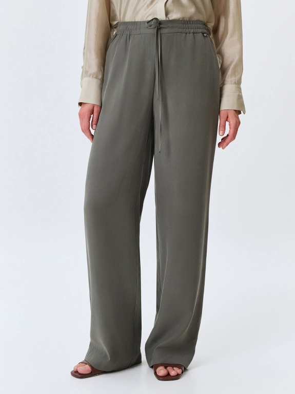 Свободные брюки из смесового района. Прямой силуэт. Резинка и кулиса по линии талии. Боковые карманы в швах.