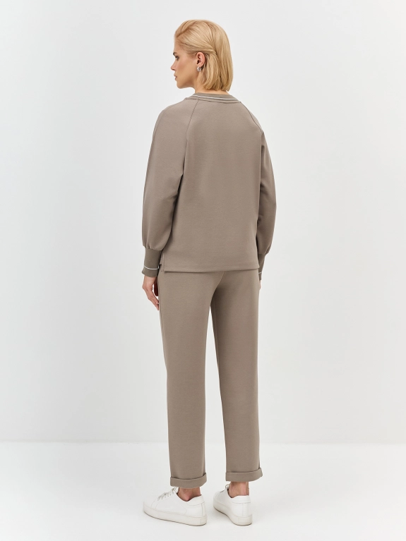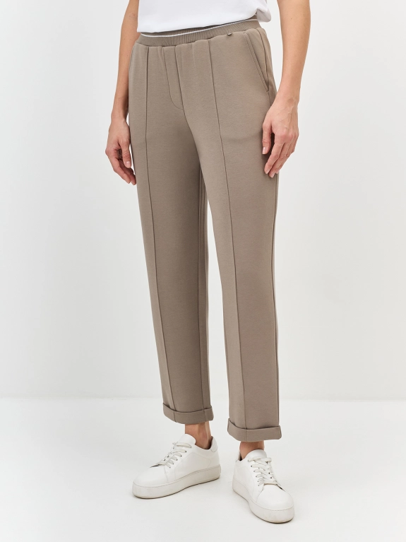 Трикотажные брюки с застроченными стрелками. Прямой силуэт немного заужен к низу. Резинка по линии талии дополнена контрастными мерцающими полосками. Боковые карманы в швах. В составе хлопок. Комплект с арт. 5257819.