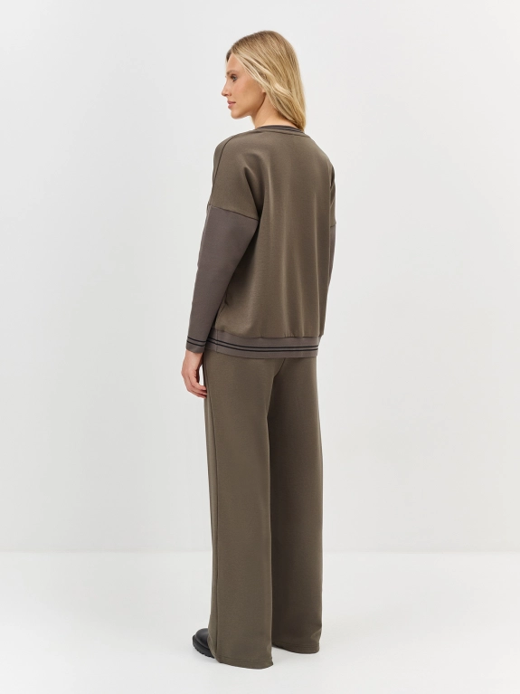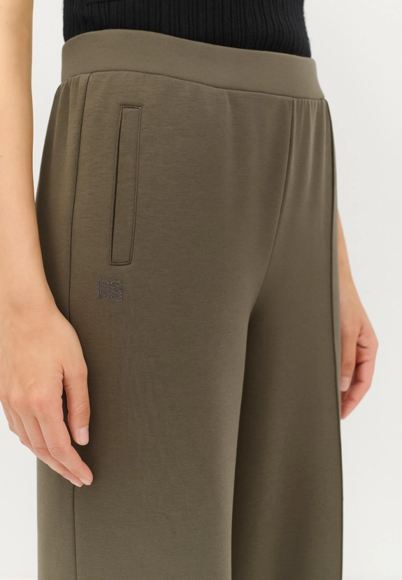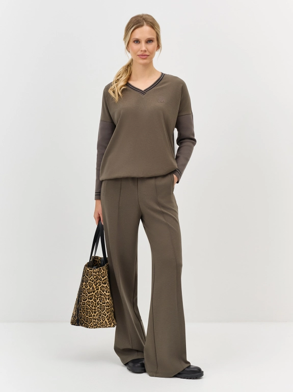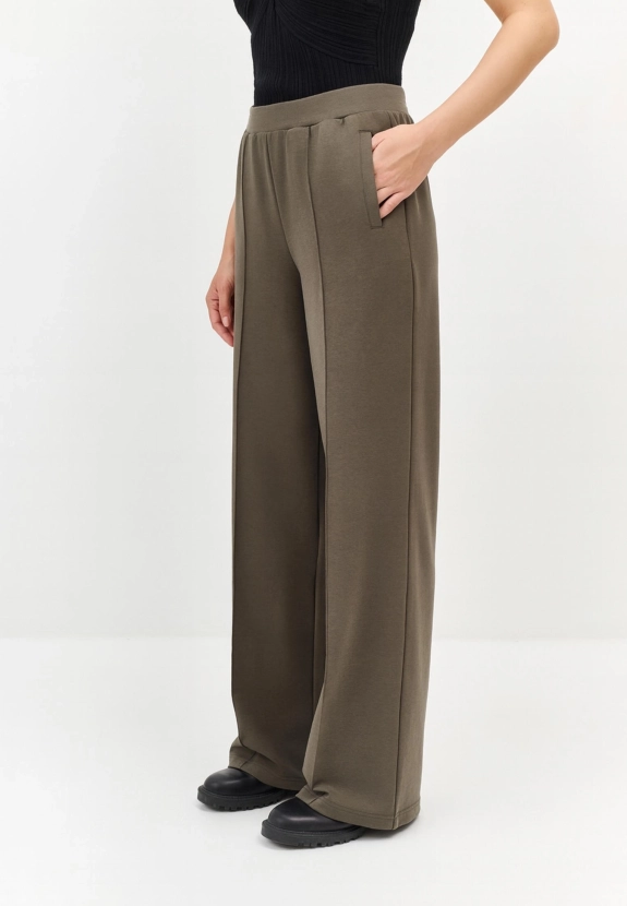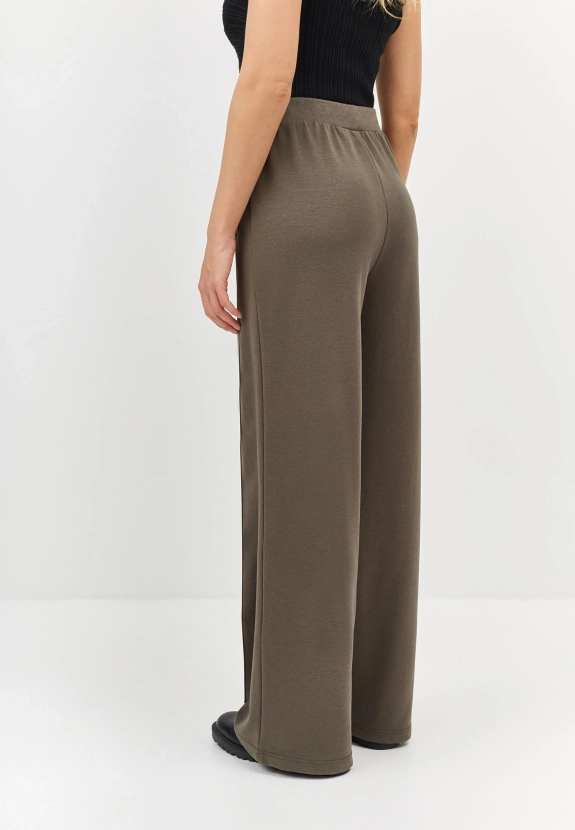 Трикотажные широкие брюки с мягкмими стрелками. Свободный силуэт. Резинка с контрастным кантом по линии талии. Боковые карманы с листочками. Деликатная вышивка в цвет. В составе модал и хлопок. Комплект с арт. 5257901.