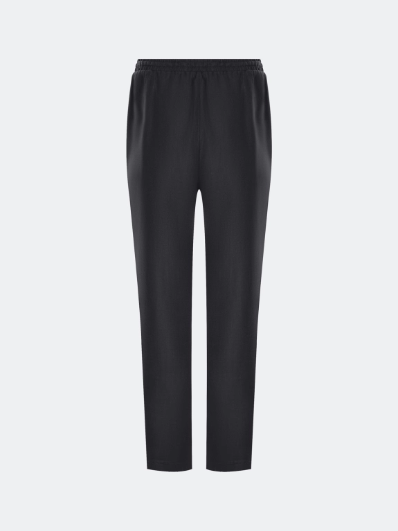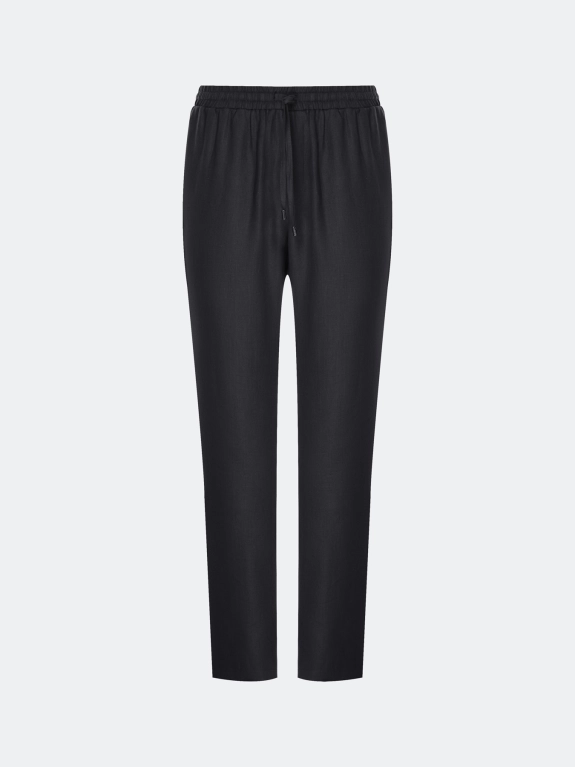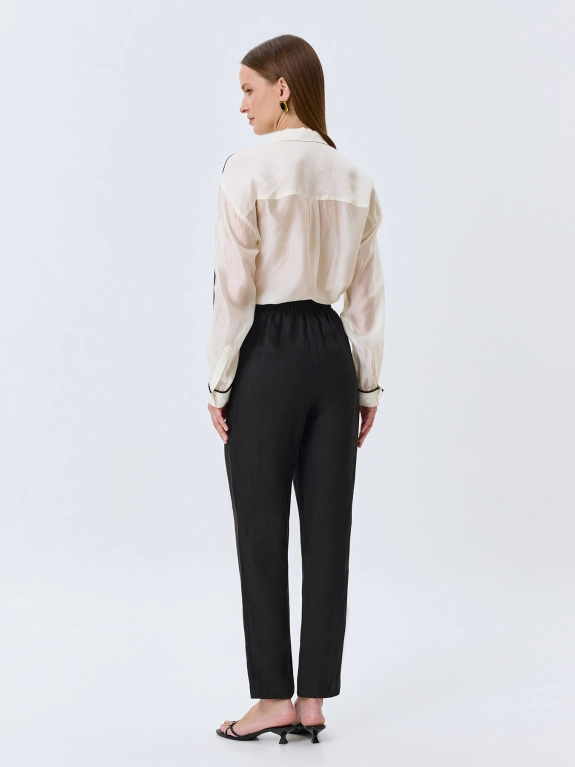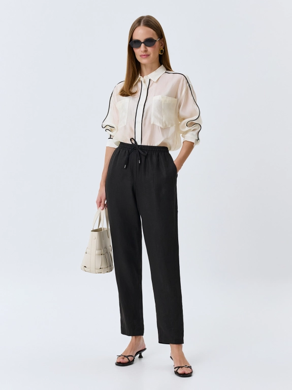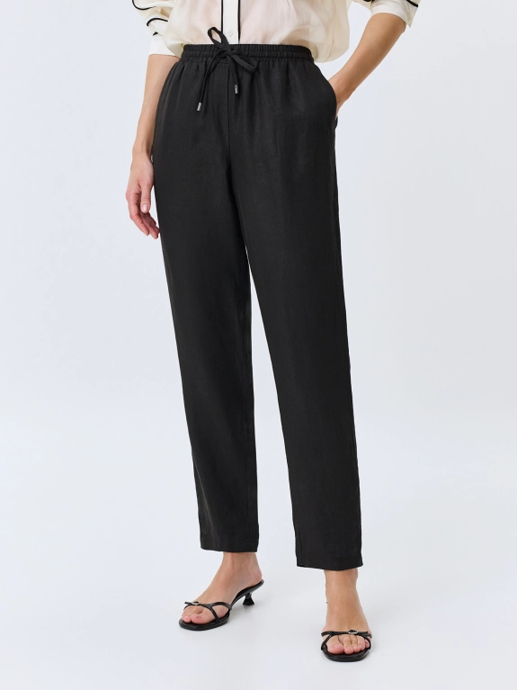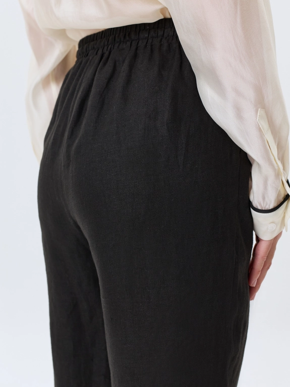 Расслабленные брюки из 100% льна. Прямой силуэт немного заужен к низу. Резинка и кулиса по линии талии. Боковые карманы в швах.