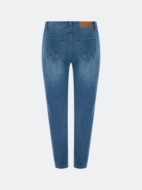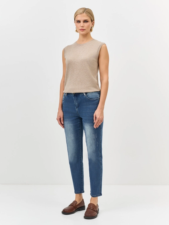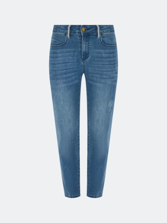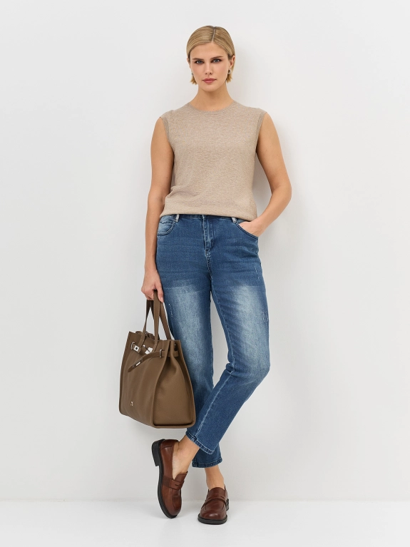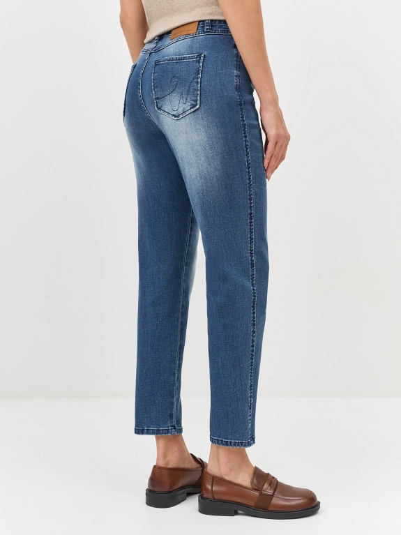 Базовые джинсы с деликатной варкой. Прямой силуэт заужен к низу. Шлёвки декорированы тесьмой. Застежка на молнию и металлическую пуговицу. Пять карманов. В составе спандекс.