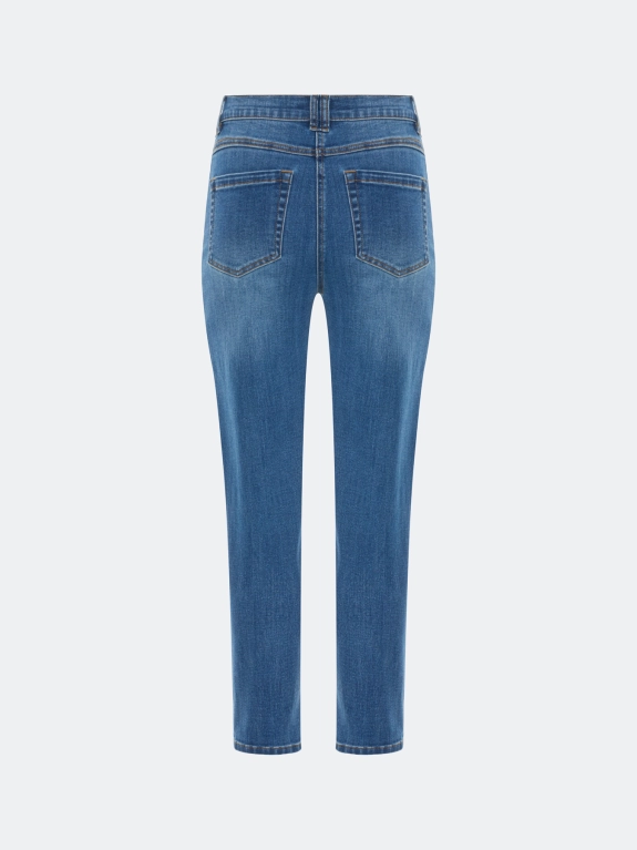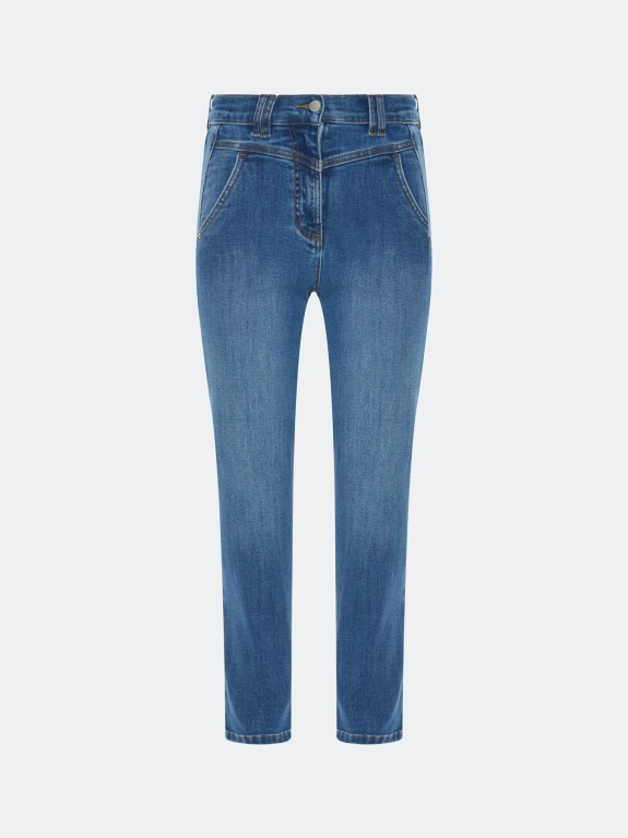 Базовые джинсы Slim fit средней посадки. Прямой силуэт немного заужен к низу. Классическая застежка на молнию и металлическую пуговицу. Кокетка обеспечивает лучшую посадку. Карманы в боковые швах и накладные карманы сзади. В составе спандекс.