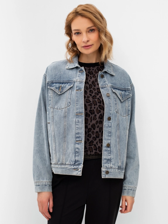 Джинсовый жакет с вышивкой на спинке. Отложной воротник. Боковые карманы с листочками. Нагрудные карманы с калапанами. Застежка на пуговицы.