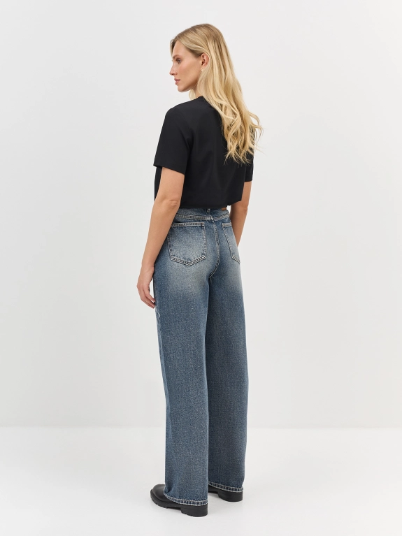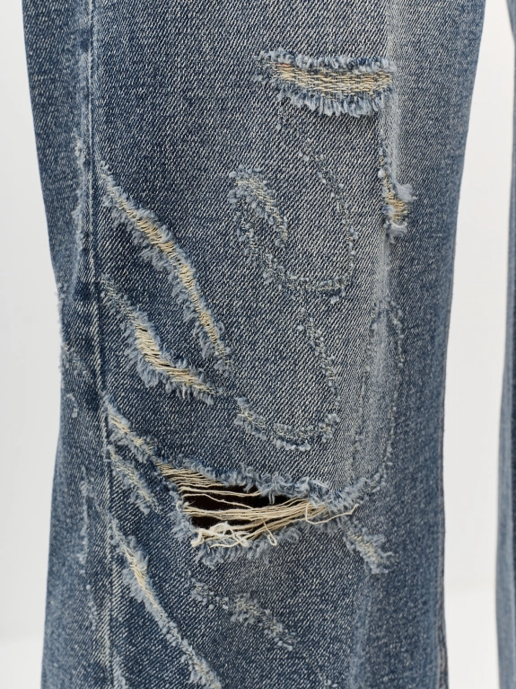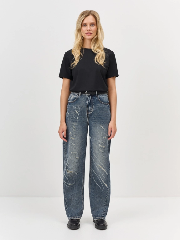 Джинсы Baggy с акцентным вензельным дестроем. Свободный силуэт. Застежка на металлическую молнию и пуговицу. Пять карманов. В составе хлопок и вискоза.