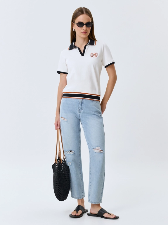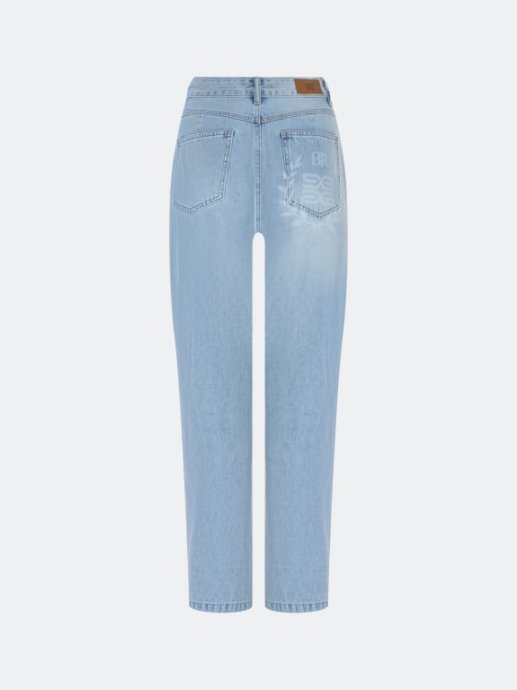 Джинсы бананы из 100% хлопка с акцентными дестроями. Прямой силуэт немного заужен к низу. Классическая застежка на молнию и металлическую пуговицу. Пять карманов. Дополнены принтом на заднем кармане.