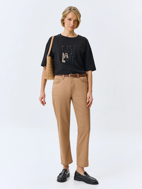 Джинсы чиносы средней посадки из смесовой эластичной вискозы. Прямой силуэт немного заужен к низу. Классическая застежка на молнию и металлическую пуговицу. Пять карманов. Дополнены вышивкой на задних карманах. В составе спандекс.