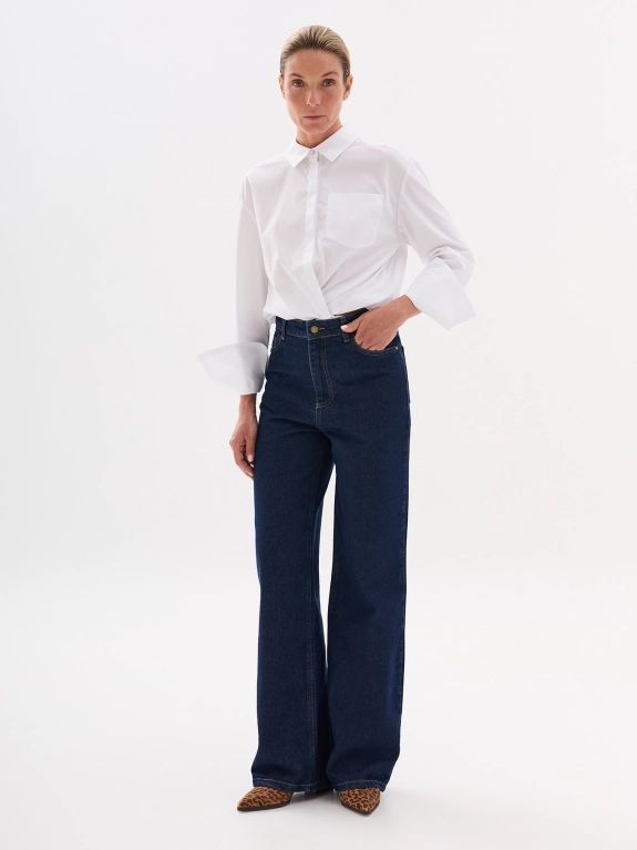 Расклешенные джинсы с высокой посадкой. Пять карманов. Застежка на пуговицу и молнию.