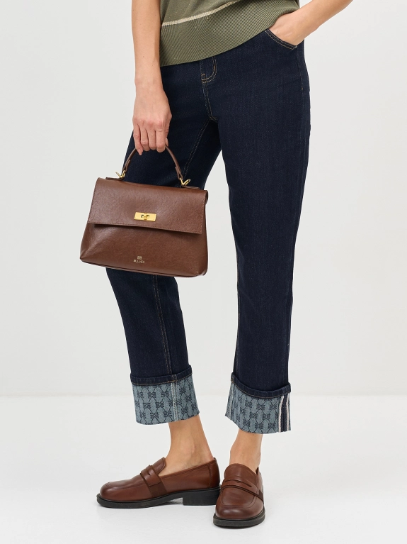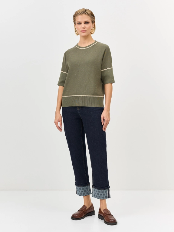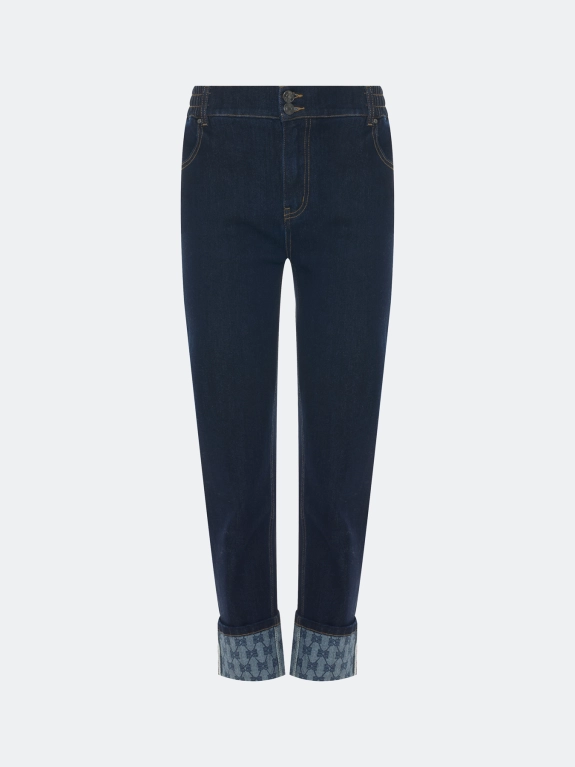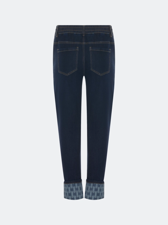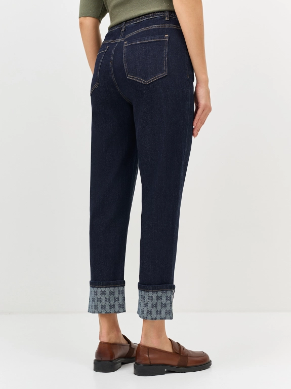 Джинсы с принтованными отворотами. Прямой силуэт немного заужен к низу. Застежка молния и металлические пуговицы. Резинка по линии талии сзади. Пять карманов. В составе эластан.