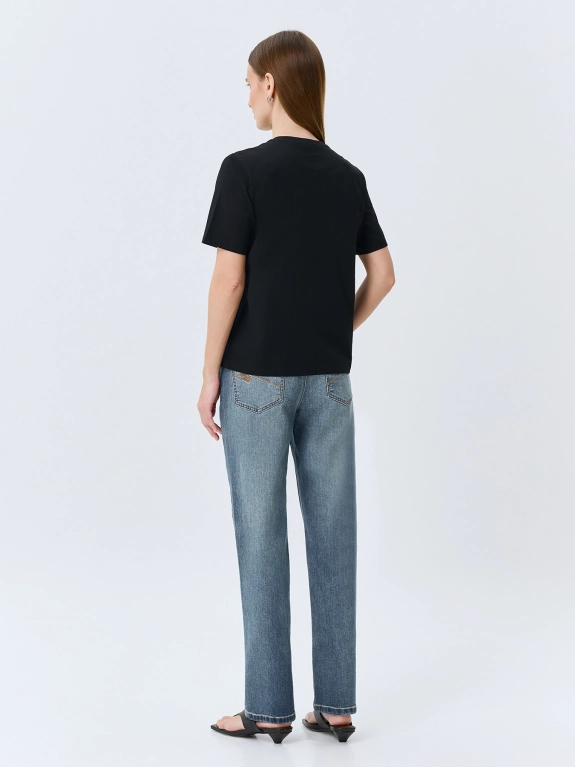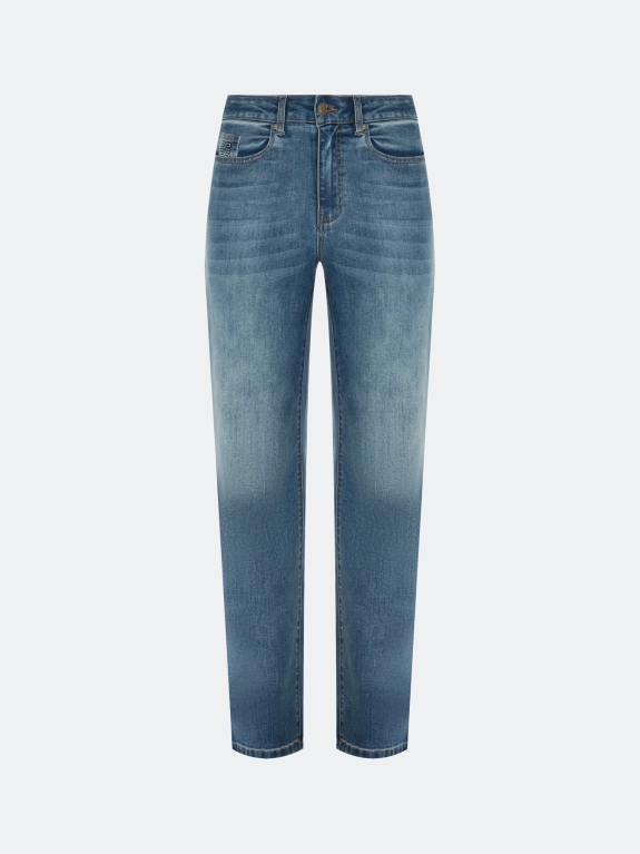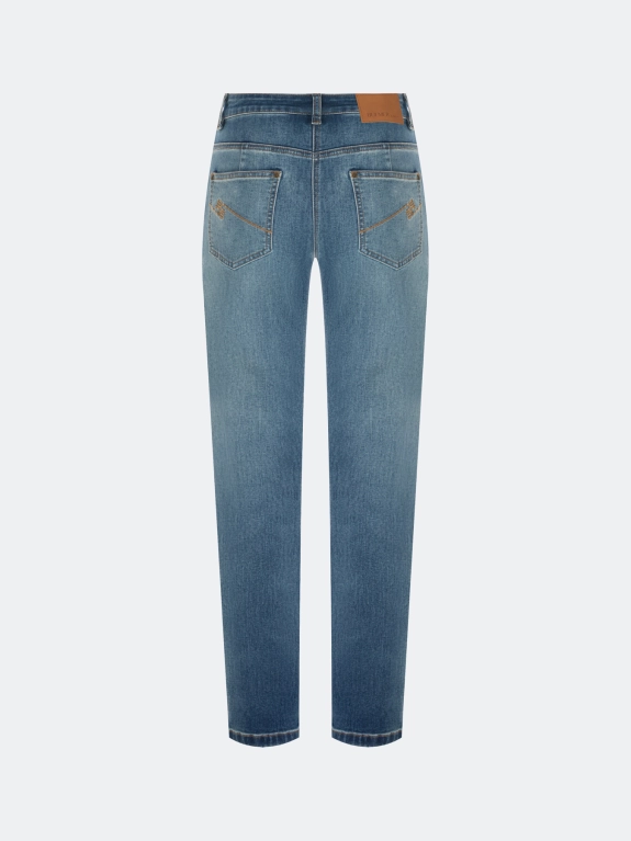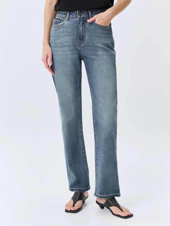 Джинсы Slim fit с деликатной варкой. Прямой силуэт заужен к низу. Классическая застежка на молнию и металлическую пуговицу. Пять карманов дополнены вышивкой. В составе спандекс.