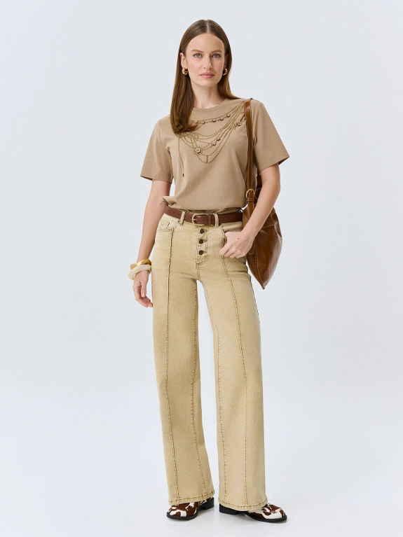 Джинсы Straight fit средней посадки с простроченными стрелками. Застежка на молнию и металлическую пуговицу. Пять карманов. Дополнены вышивкой на задних карманах. В составе вискоза.