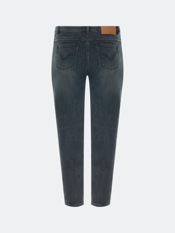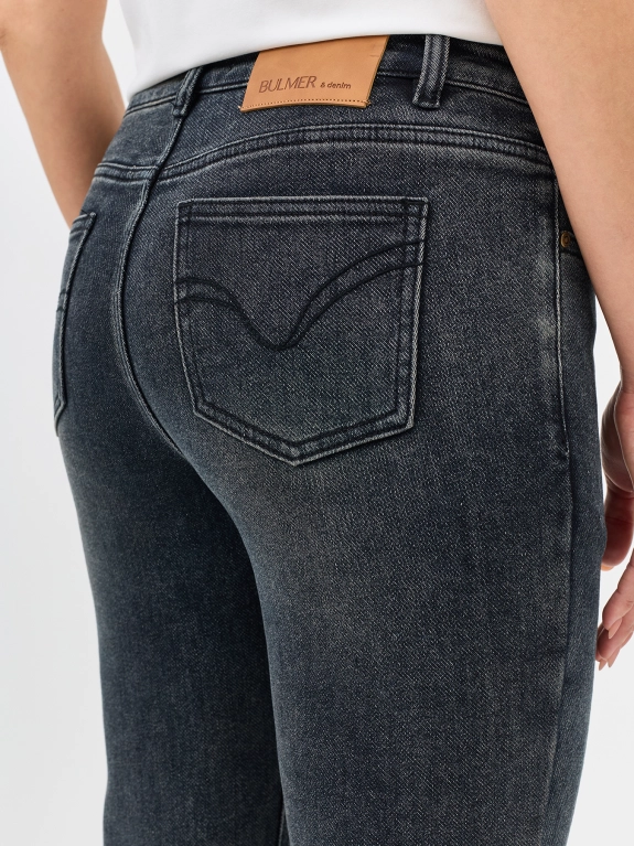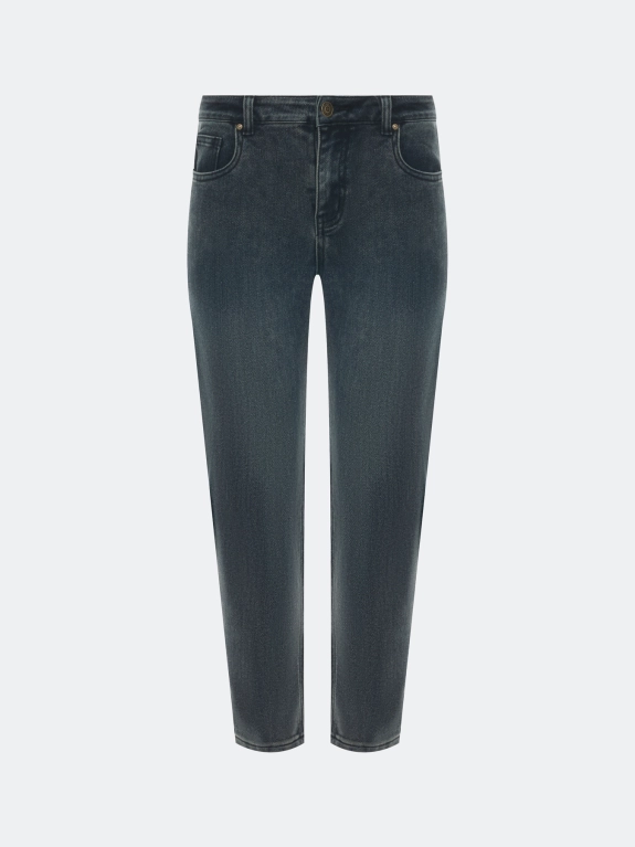 Графитовые джинсы из комфортного высокоэластичного денима с деликатной варкой. Особое переплетение нитей ткани придает дополнительный комфорт и лучшую посадку на фигуре. Прямой силуэт заужен к низу. Застежка на молнию и металлическую пуговицу. Пять карманов. В составе спандекс и район.