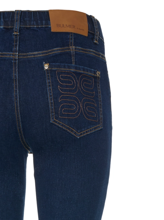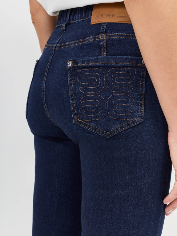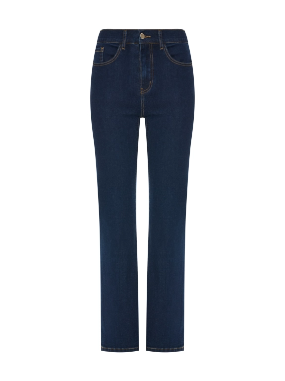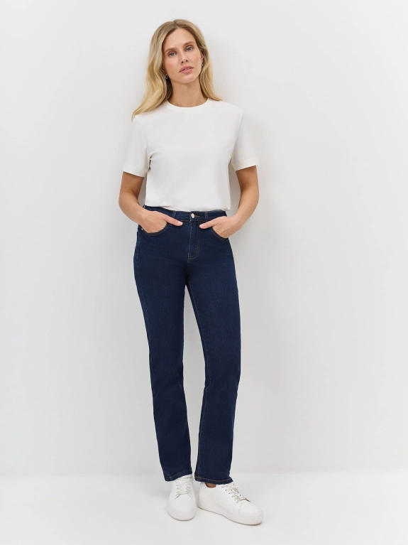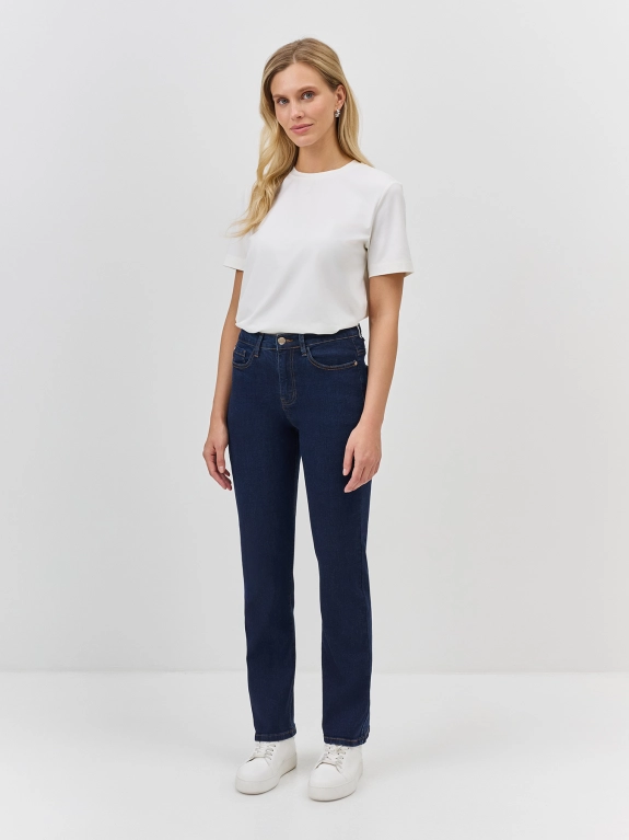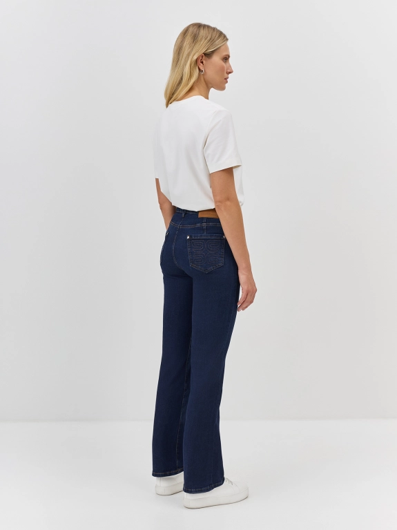 Классические прямые джинсы из эластичного денима. Застежка на молнию и металлическую пуговицу. Пять карманов. Классическая контрастная строчка. Деликатная вышивка на заднем кармане.