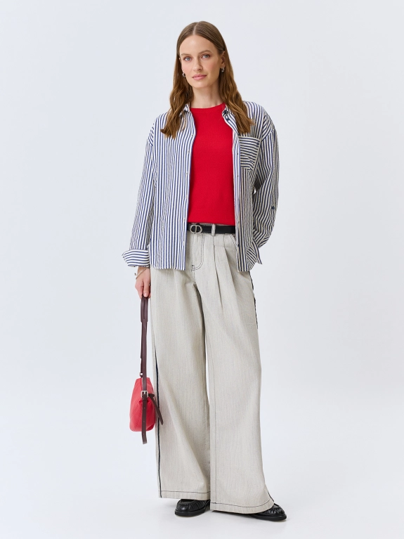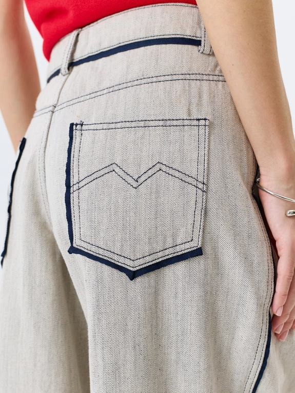 Меланжевые джинсы Wide leg средней посадки. Свободный силуэт. Застежка на молнию и металлическую пуговицу. Четыре кармана. Боковые карманы в швах. Дополнены двойными складками. Контрастные лампасы и кант по задним карманам и поясу. В составе 100% хлопок.