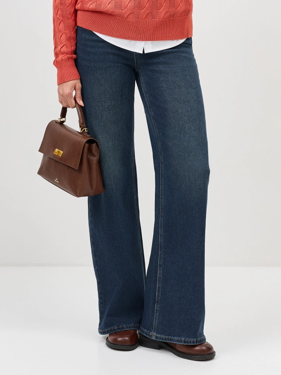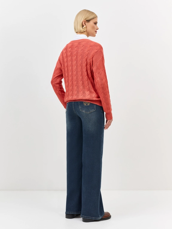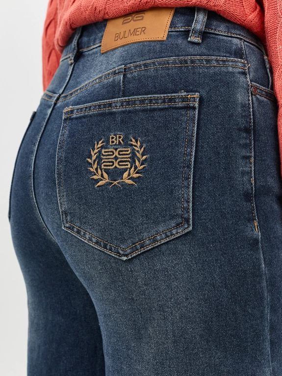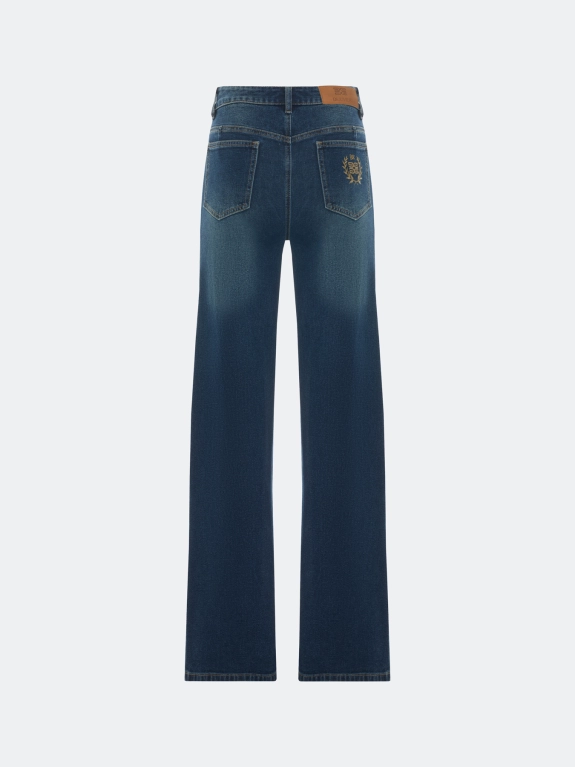 Широкие прямые джинсы с деликатной варкой и акцентной гербовой вышивкой на заднем кармане. Прямой силуэт. Застежка на молнию и металлическую пуговицу. Пять карманов. В составе спандекс.