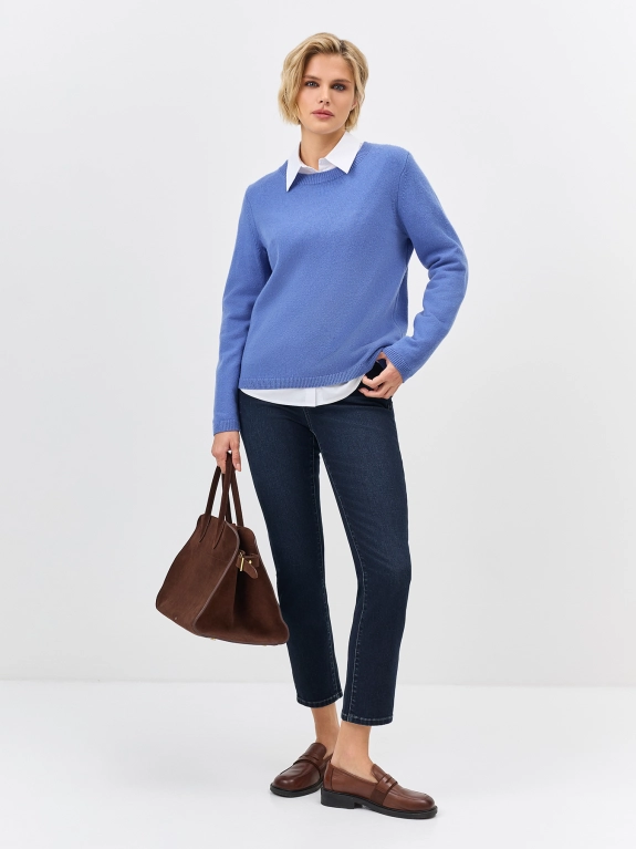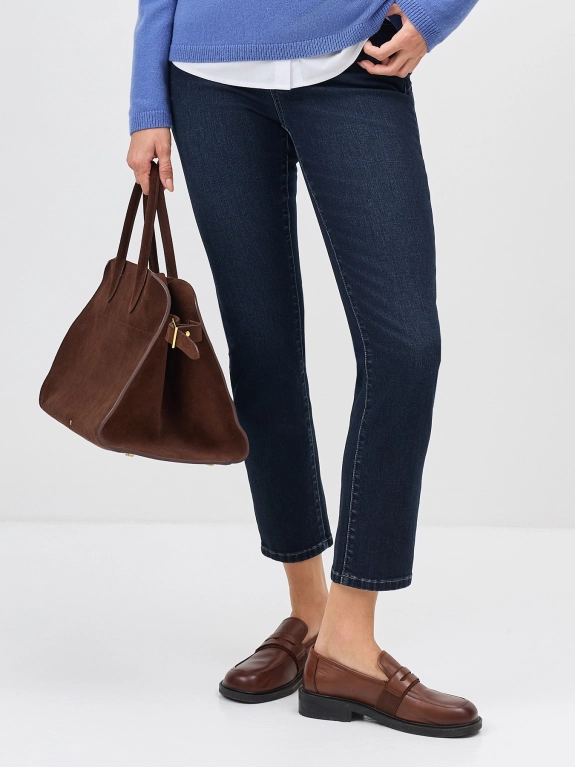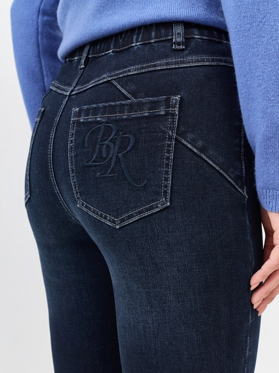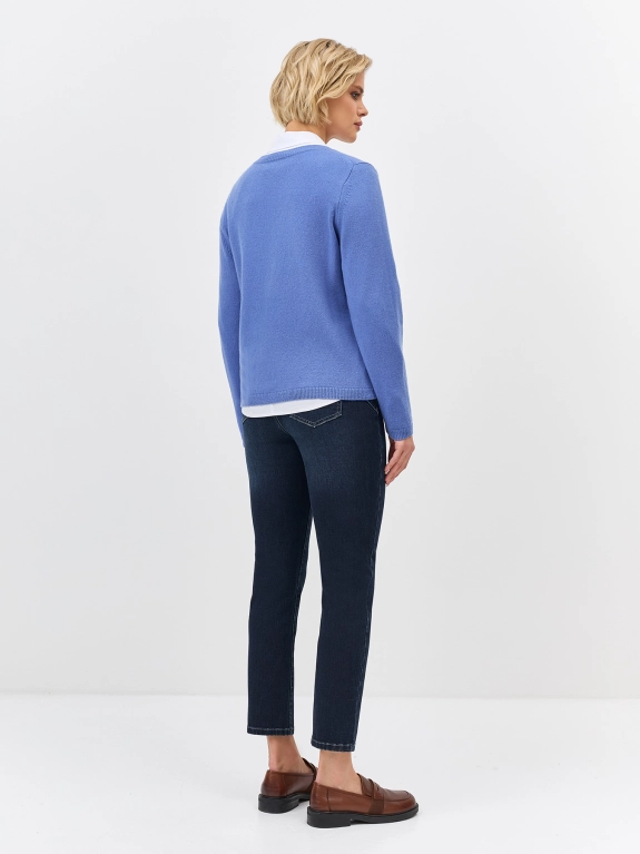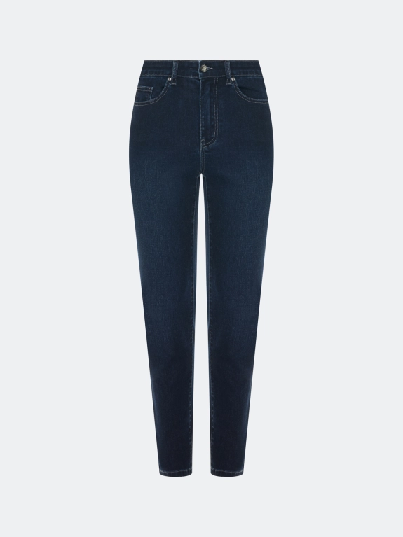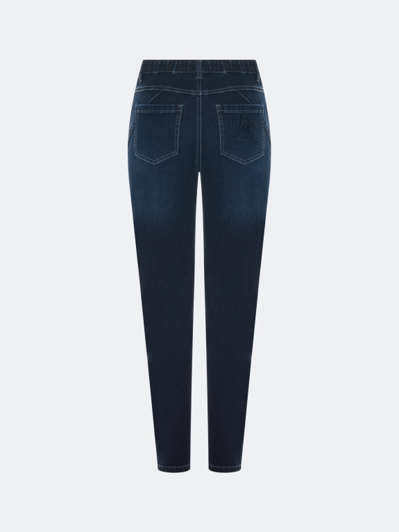 Синие джинсы SlimFit. Прилегающий силуэт. Застежка на молнию и металлическую пуговицу. Пять краманов. Дополнены деликатной вышивкой в цвет на заднем кармане. В составе спандекс.
