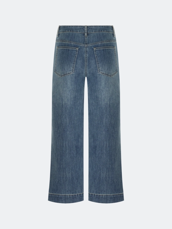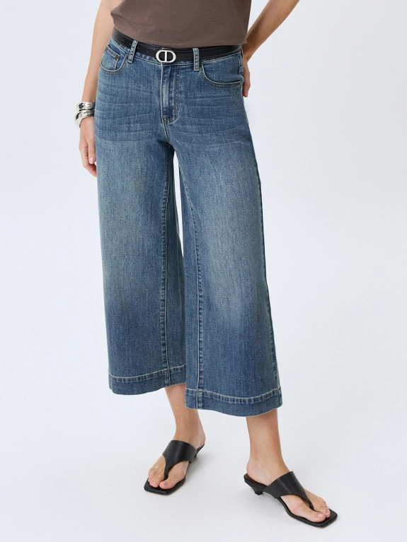 Укороченные джинсы кюлоты с деликатной варкой. Прямой силуэт. Классическая застежка на молнию и металлическую пуговицу. Пять карманов. В составе спандекс.