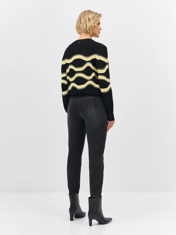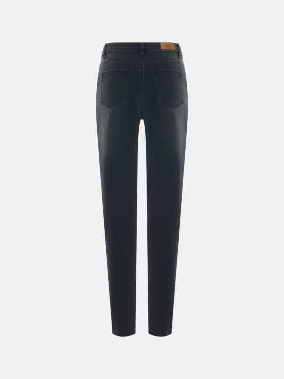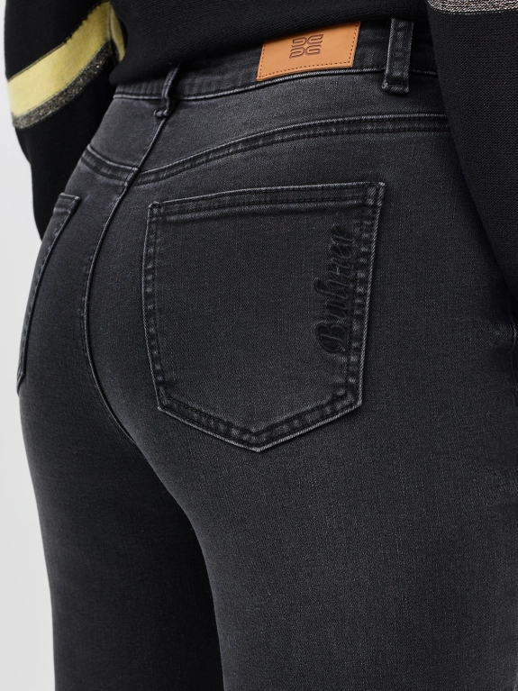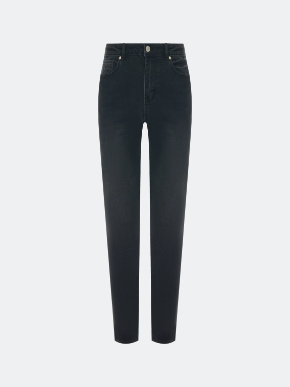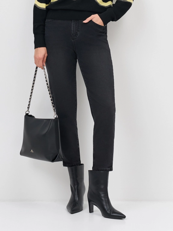 Графитовые джинсы с деликатной варкой. Прямой силуэт заужен к низу. Застежка на молнию и металлическую пуговицу. Пять карманов. В составе спандекс.