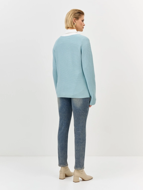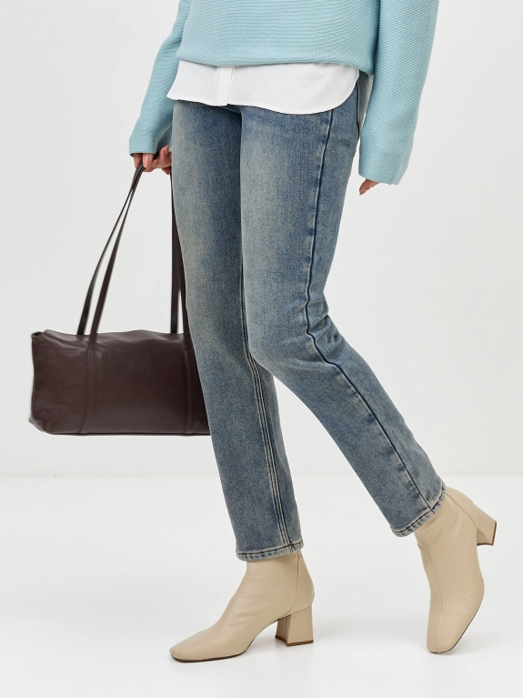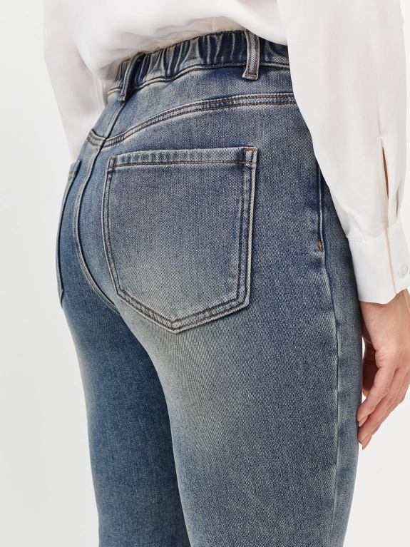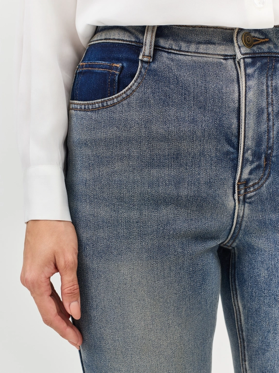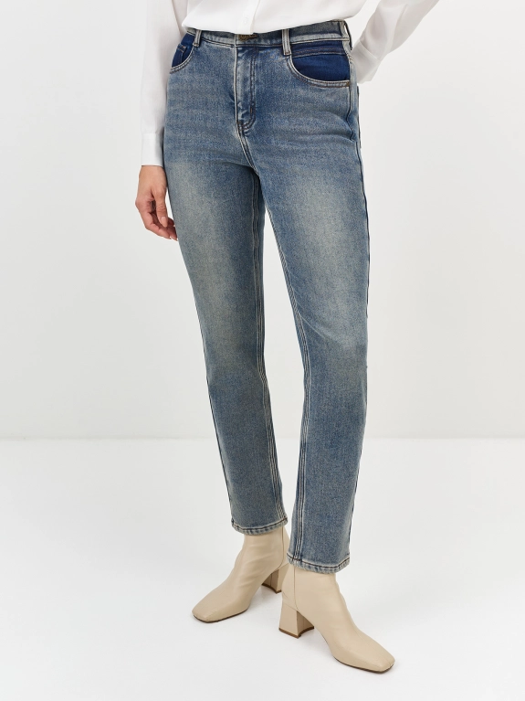 Утепленные джинсы с контрастными карманами. Зауженный силуэт. Застежка на молнию и металлическую пуговицу. Пять карманов. Резинка по линии талии сзади. В составе спандекс.