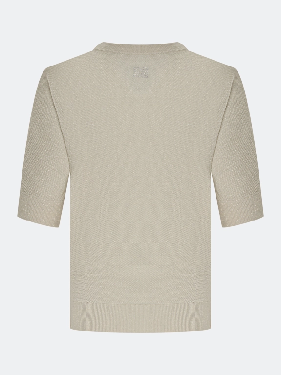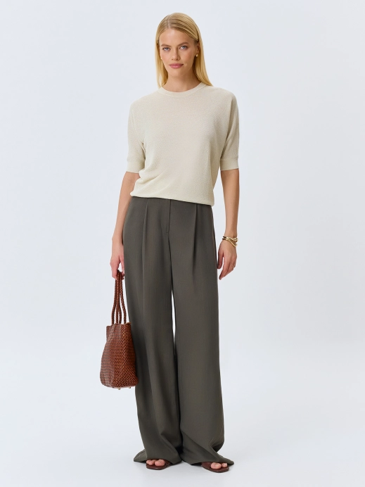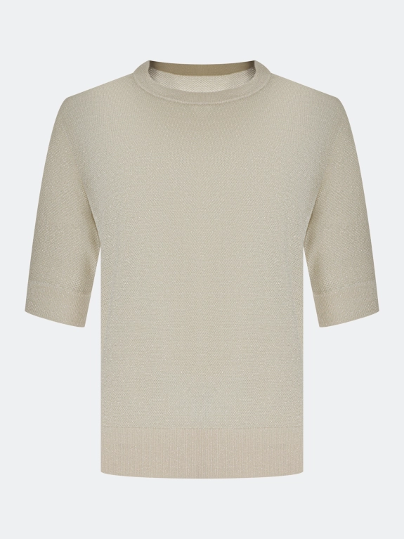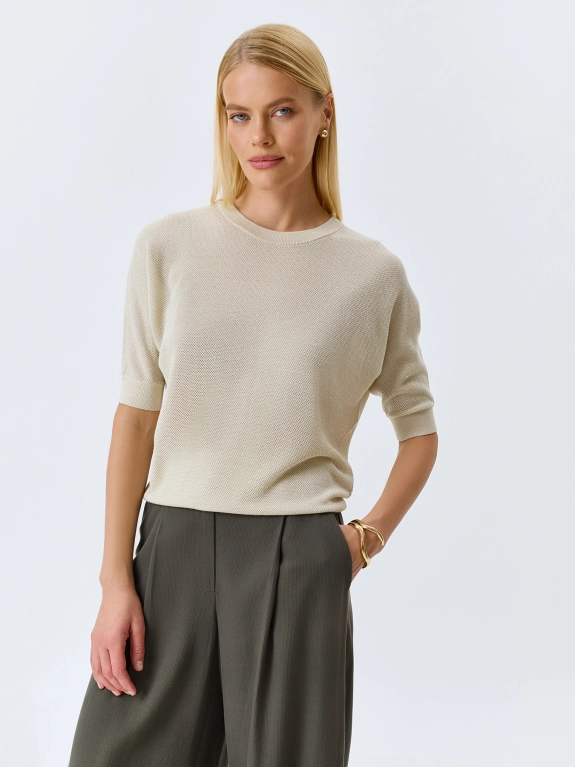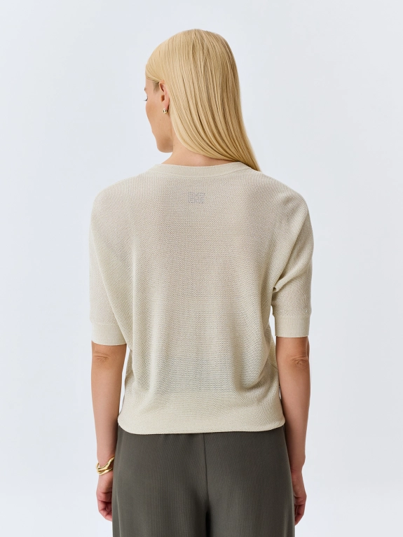 Вязаный ажурный джемпер из смесового тенселя и района с добавлением люрекса. Свободный силуэт. Круглый вырез. Цельнокроенные укороченные рукава. Дополнен рибом по низу изделия и рукавов.