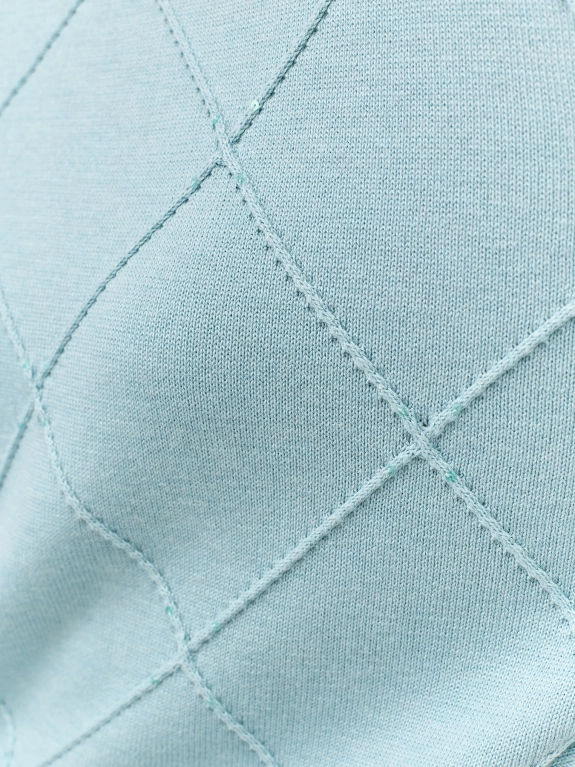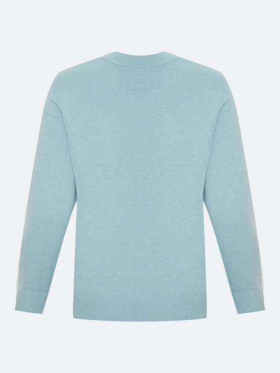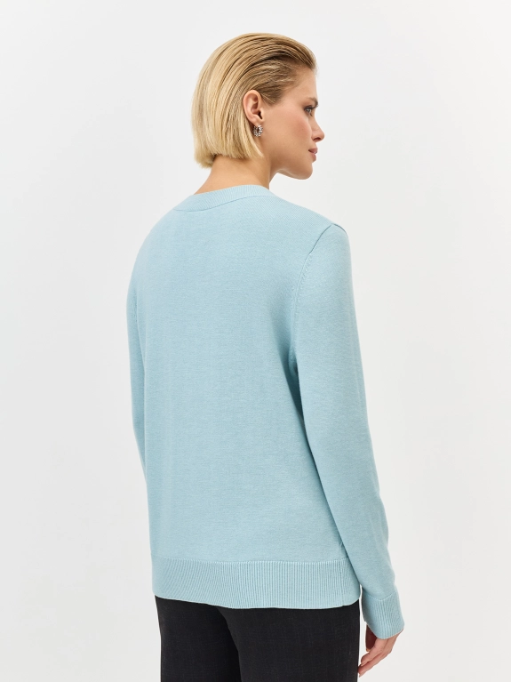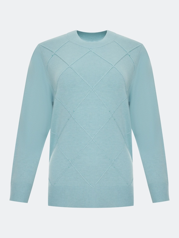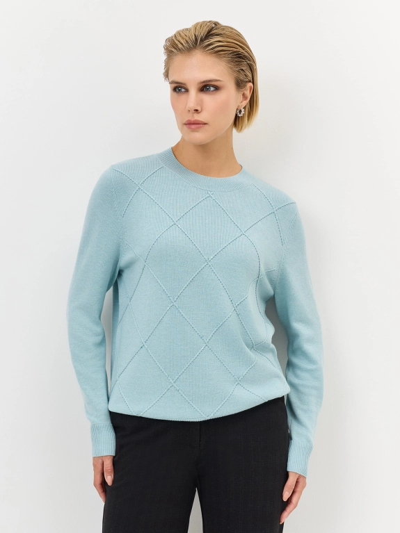 Джемпер фактурной вязки с узором ромбы и деликатными пайетками. Прямой силуэт. Круглый вырез. Длинные втачные рукава. В составе вискоза и кашемир.