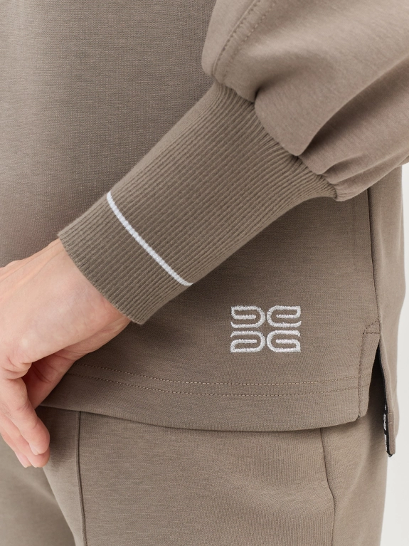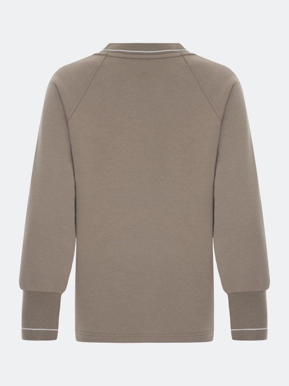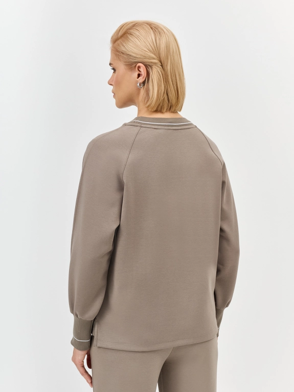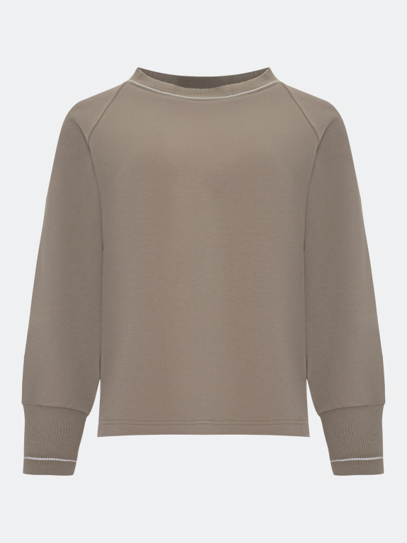 Джемпер из хлопкового джерси свободного силуэта. Круглый вырез. Риб по горловине и низу рукавов декорирован контрастной полоской. Дополнен деликатной вышивкой люрексом. Длинные рукава реглан. Боковые разрезы. Спинка немного удлинена. Комплект с арт. 5257821.