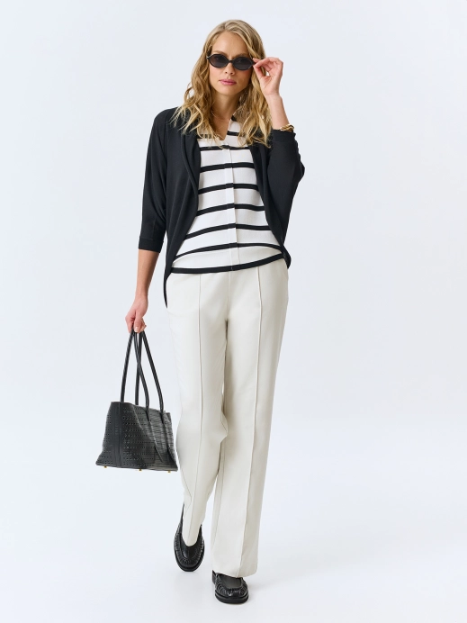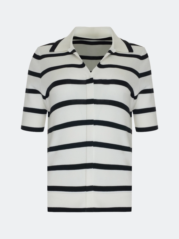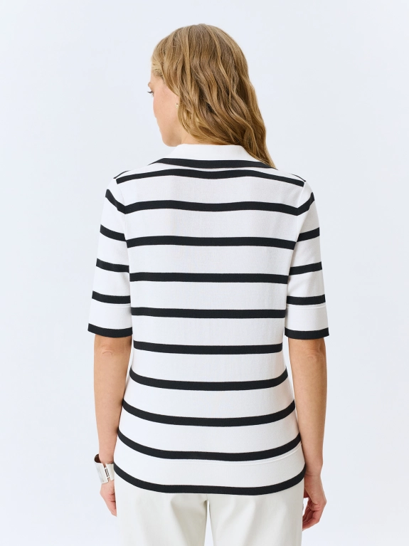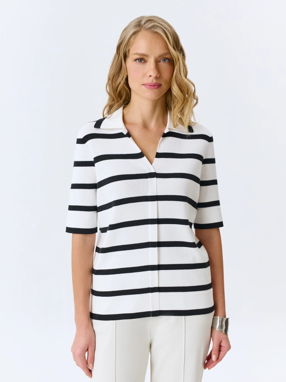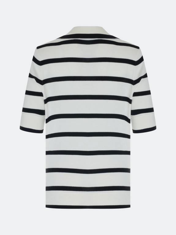 Вязаный джемпер в контрастную полоску из мягкого модала и хлопка. Полуприталенный силуэт. Отложной воротник дополнен V-образным вырезом. Укороченные рукава. Застежка на пуговицы.