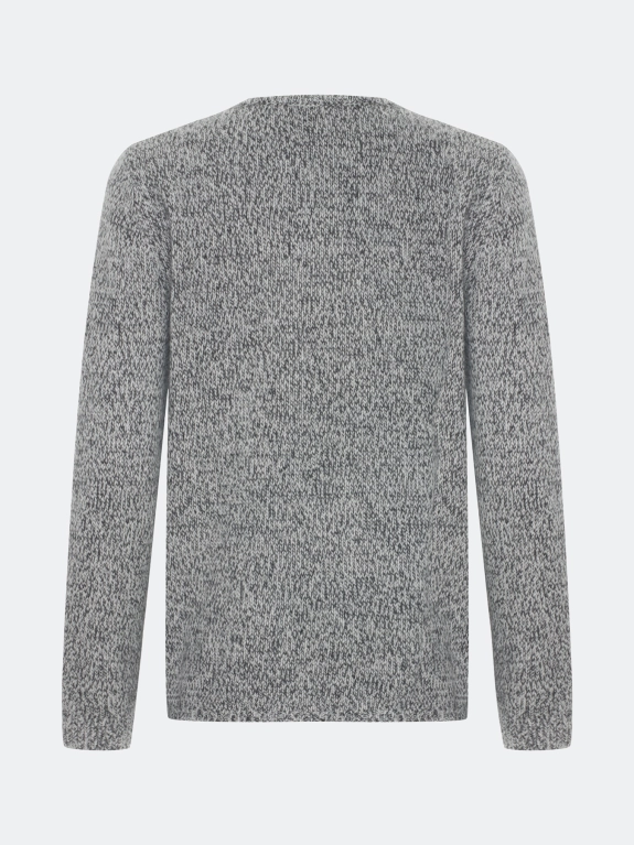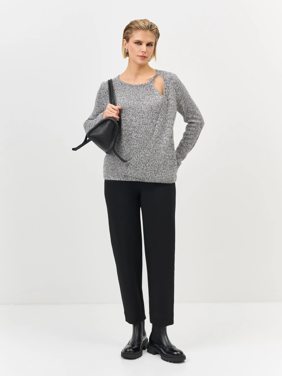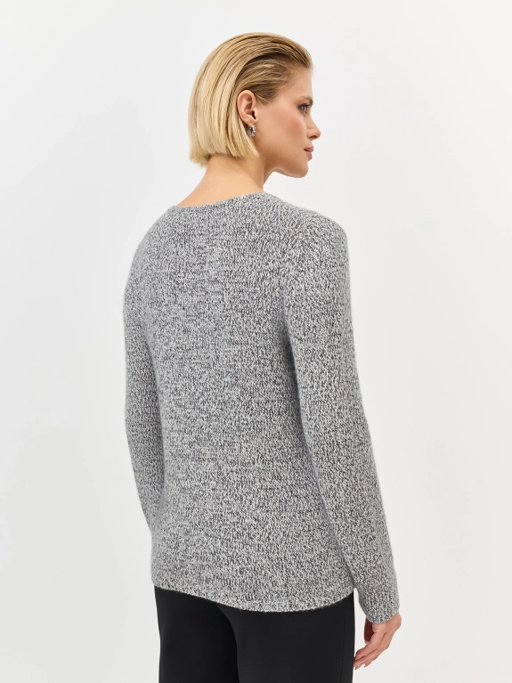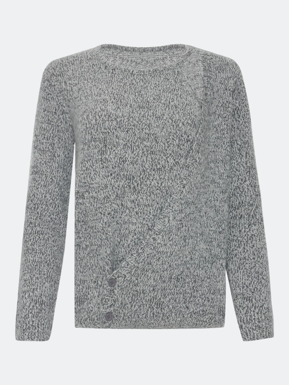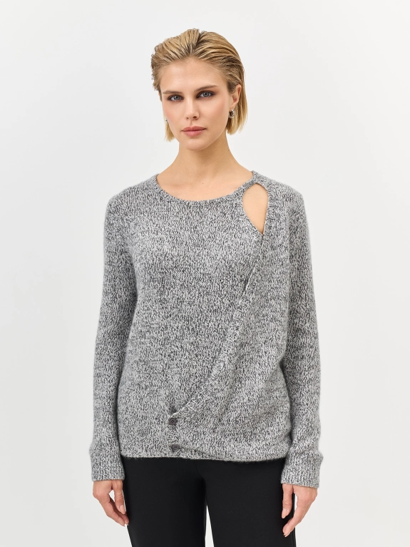Меланжевый джемпер с асимметричной застежкой. Свободный силуэт. Круглый вырез. Застежка с запахом на пуговицах образует деликатный вырез на груди. В составе шерсть и ангора.