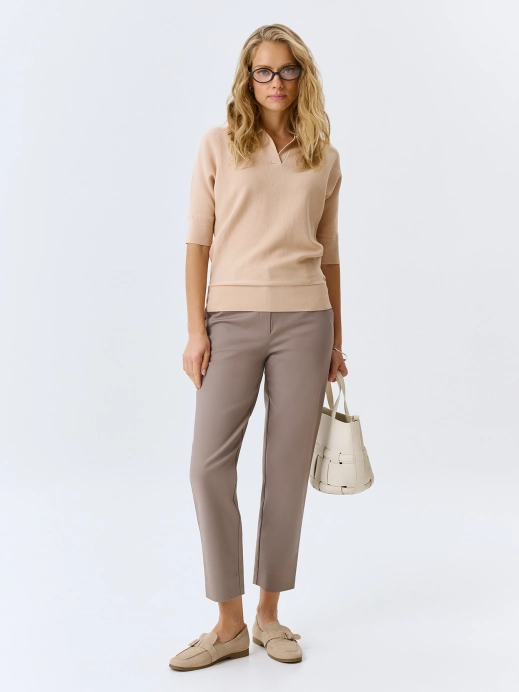 Трикотажный джемпер свободного силуэта с асимметричной ажурной вышивкой. Круглый вырез дополнен рибом. Цельнокроенные рукава 3/4. Дополнен разрезами в боковых швах.