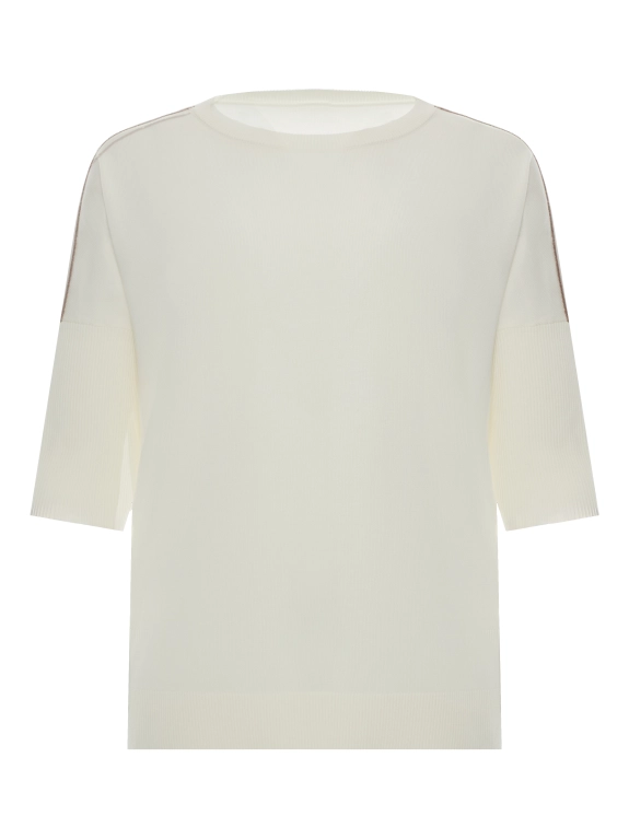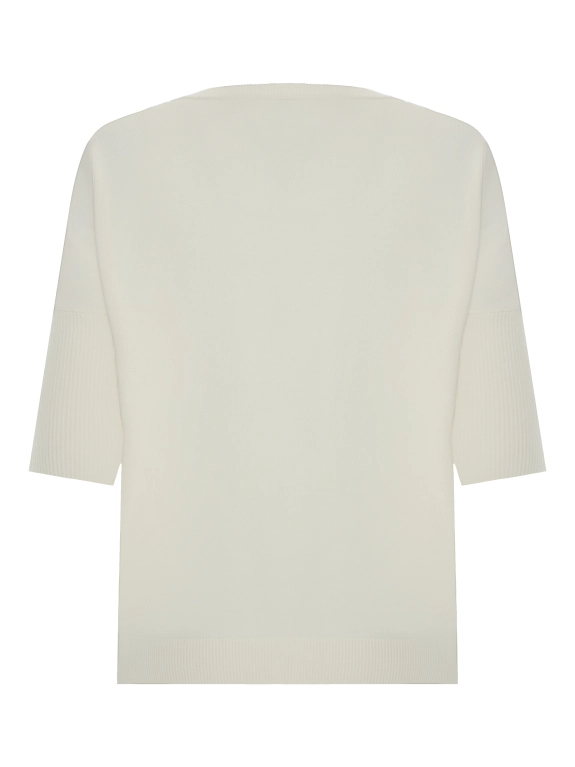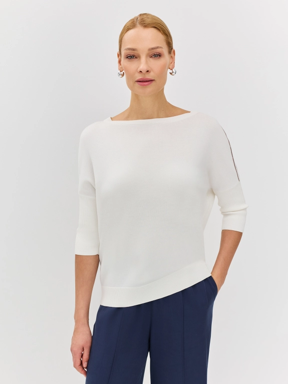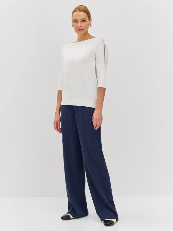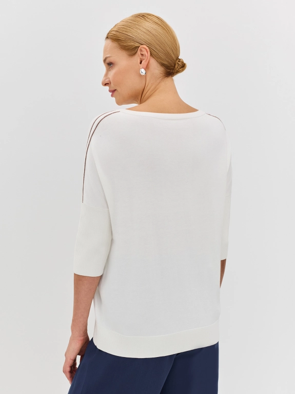 Джемпер отличается свободным силуэтом, круглой горловиной и укороченным рукавом 3/4, создавая утонченный и модный образ. Изысканный декор из нитей монили по линии плеч придает джемперу особый шарм и подчеркивает утонченный вкус.