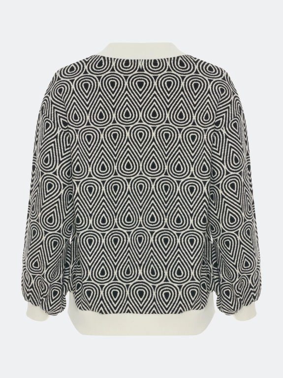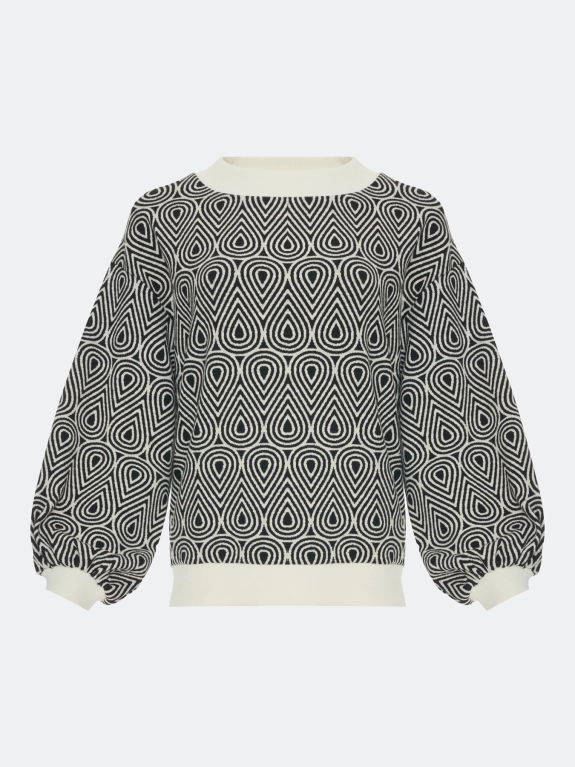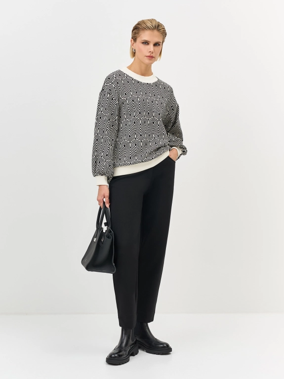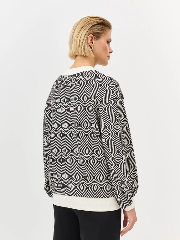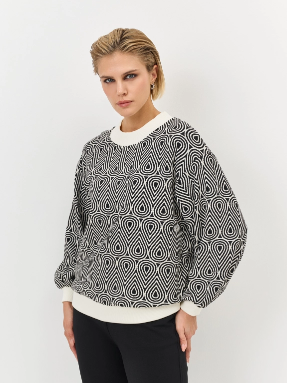Джемпер из трикотажа с монохромным графичным принтом свободного силуэта. Круглый вырез. Спущенная линия плеч. Объемные длинные рукава. Контрастный риб по горловине, низу рукавов и изделия. В составе хлопок и вискоза.