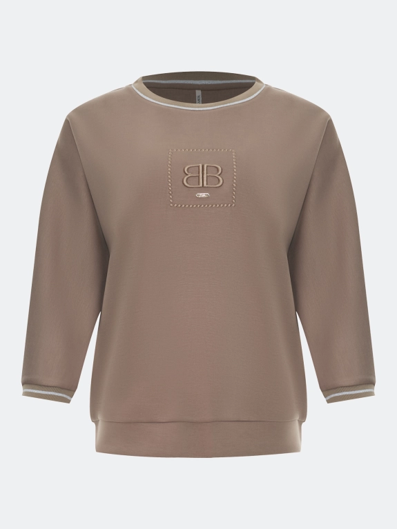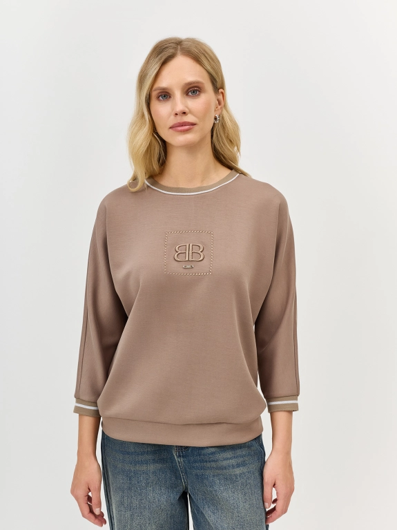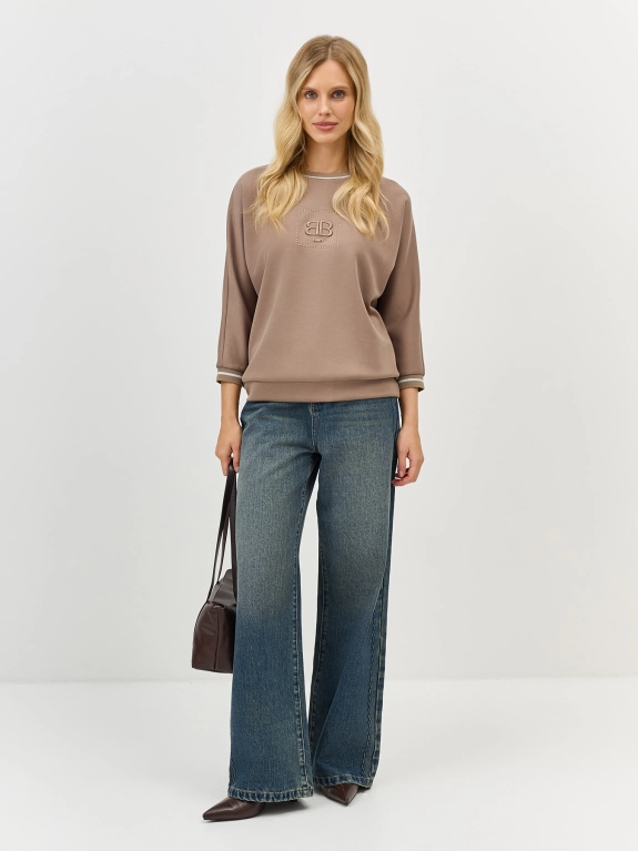Трикотажный джемпер свободного силуэта с минималистичной вышивкой в цвет ткани. Круглый вырез. Контрастный риб с деликатным люрексом по горловине и низу укороченных рукавов. В составе модал.