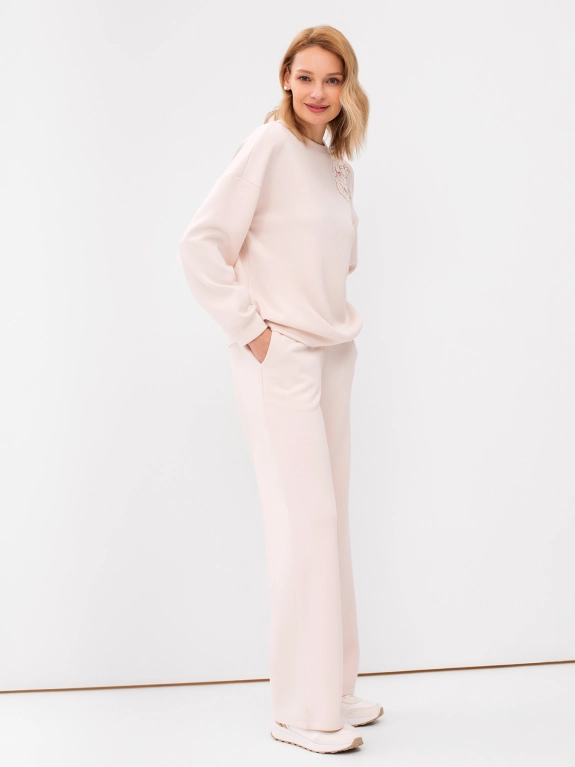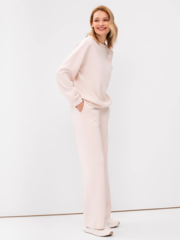 Трикотажный джемпер свободного силуэта. Плечо немного спущено. Круглая горловина. Разрез в левом плечевом шве. Акцентная вышивка на полочке. Комплект с 4245864.