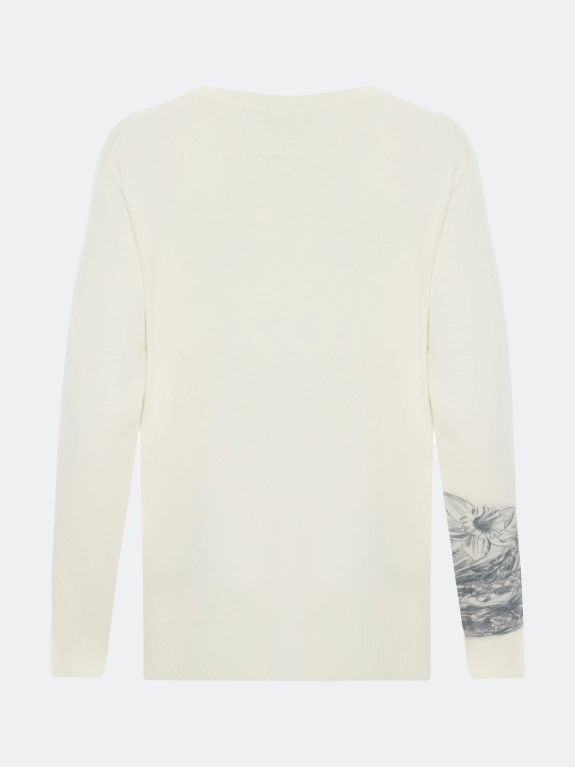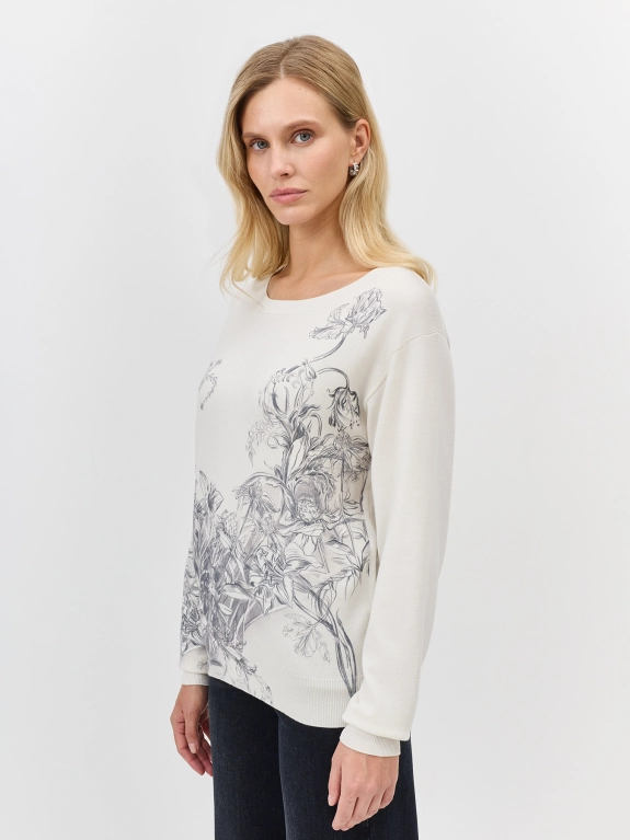 Вязаный джемпер с деликатным цветочным принтом из смесовой вискозы. Прямой силуэт. Вырез лодочка. Линия плеч немного спущена. В составе шерсть.