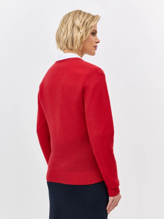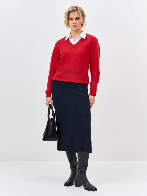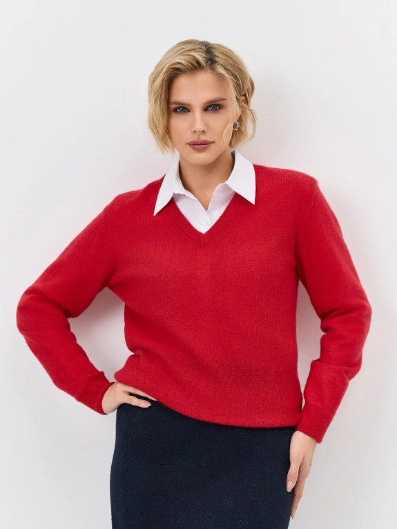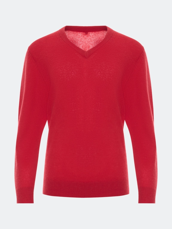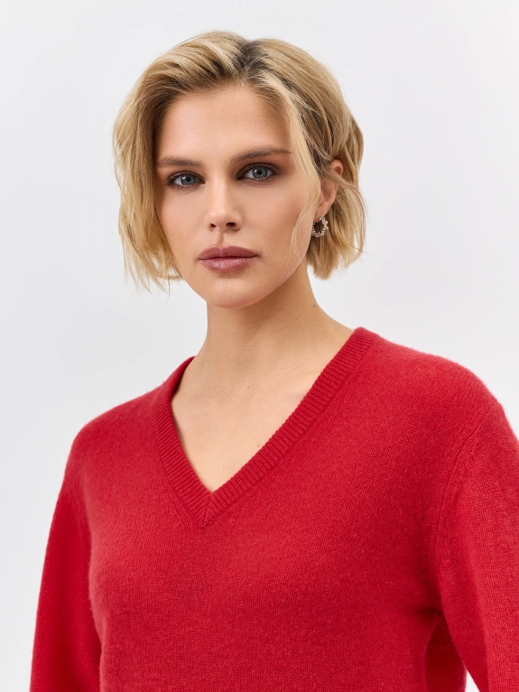 Джемпер с V-образным вырезом из 100% кашемира. Прямой силуэт. Линия плеч немного спущена. Манжеты по низу рукавов и изделия.
